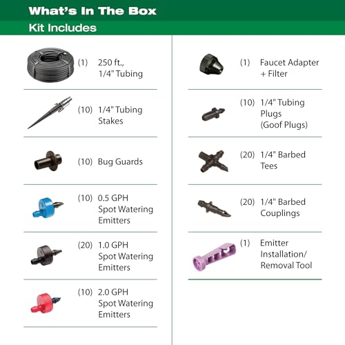 Rain Bird DRIPPAILQ Drip Irrigation Repair and Expansion Kit. This convenient and portable storage dispenser kit contains all of the parts and tools commonly needed to repair and expand a Drip irrigation system. Contains 112 professional grade universal Drip irrigation parts such as: emitters, tees, couplings, plugs, stakes, and a 1/4” faucet adapter. Stored beneath the removable top tray is a 250' roll of 1/4" distribution tubing. Intelligent design allows tubing to dispense through top tray; cut to length as needed while it always stays neatly rolled up…not loose and tangled. With this kit, you’re prepared to handle common maintenance projects such as: repairing tubing breaks, replacing a clogged emitter, adjusting flow for growing plants, or expanding coverage to adjacent planting beds. Includes 40 pressure compensating self-piercing emitters: (10) 0.5 GPH, (20) 1.0 GPH, and (10) 2.0 GPH. Rain Bird’s patented Emitter Installation and Removal Tool makes it easy to work with spot watering emitters as well as 1/4” barbed fittings. Trouble shooting guide provides tips on system maintenance, suggesting where common problems may occur and showing how to correct them by adjusting flow or fixing clogs and breaks. Rain Bird “The Intelligent Use of Water”