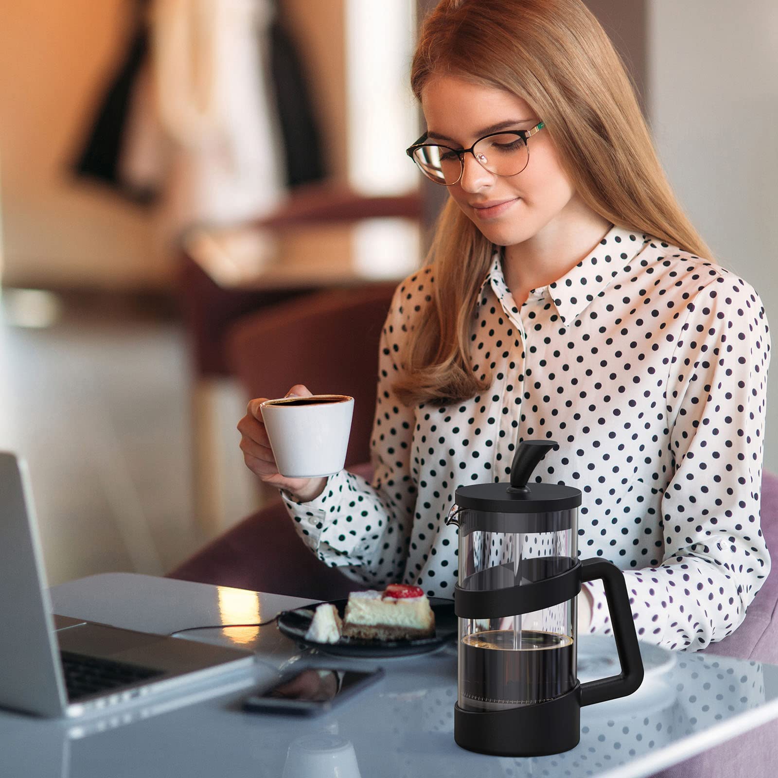 • STYLISH AND DURABLE DESIGN: Small coffee presses carafe made of durable, heat-resistant German borosilicate glass and has good heat insulation effect ; The ergonomic handle is comfortable to grip,the base and handle are made of BPA-free polypropylene and you don't touch hot glass !