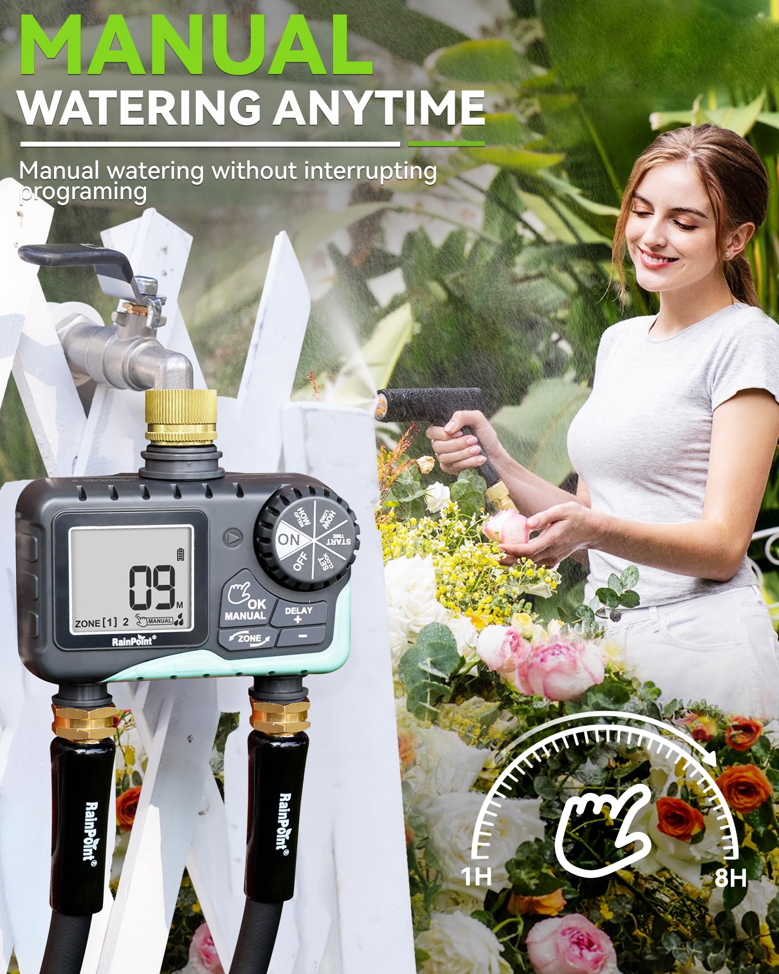 RAINPOINT Water Timer for Garden Hose - Sprinkler Timer with Brass Swivel - Rain Delay/Manual Watering/Automatic Irrigation Programmable Faucet for Yard, 2 Outlet