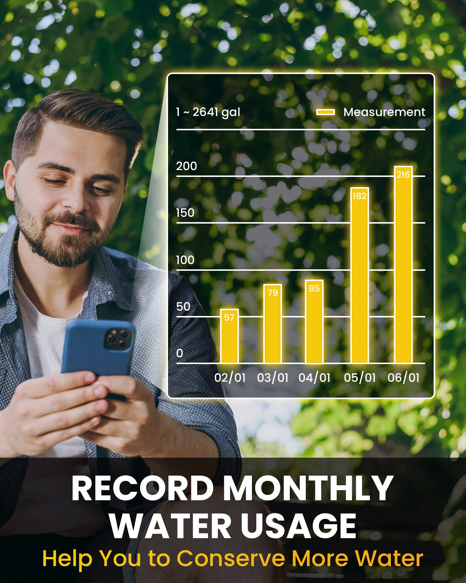 • MONITOR WATER CONSUMPTION IN REAL TIME >> With a built-in water flow meter inside, this intelligent sprinkler timer can tell you how much water you have used in your garden. And you can view the report about the watering historical data with gallons or liters. Allows you to quickly know about your water consumption in real-time and adjust your water-saving plan in time, saving your money and water.
