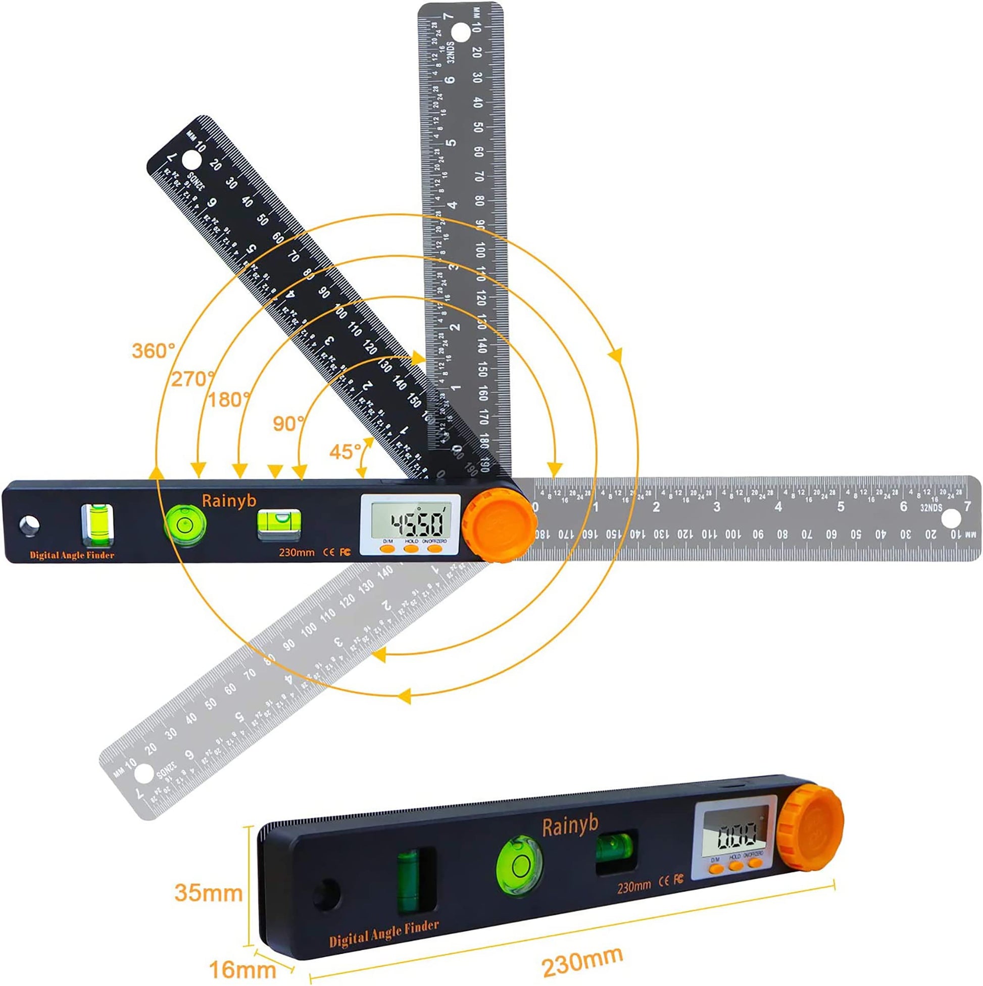 Details: Rainyb digital angle finder tools will bring reliability and convenience to your work. Widely used in woodworking furniture, building materials decoration, schools, home DIY, mechanical processing and other fields. 1. 360 Degreeinternal and external angle measurement, you can keep the data at any position to facilitate the reading after measurement. 2. Great Locking Feature The tightloose knob works well and you can set the Angle Finder to the tightness that suits your use. 3.The full screen super large LCD displays the measurement data, and the reading is simple and convenient. 4.Fine textured engineering materials, lightweight, wear resistant, non deformed, non scratch. Feature: 1. Four in one multi function digital protractor: A: Measuring angle 0 360 Degree; B: Engraved line length: 190 mm7 inches; C: Horizontal and vertical measurement; D: Plane universal measurement; 2. Enlarged and thickened knobs, easy to tighten, convenient and reliable measurement. 3. Display unit: arbitrary conversion between degrees and minutes. 4. Any position can be cleared, which is convenient for absolute and relative measurement. 5. With automatic power off function, save power consumption and extend battery life. 6. The flat back of the ruler body is convenient for marking and measuring. Specification: Working Temperature: 0 Degree C to +50 Degree C Working Humidity: ≤85percentRH Working Current: ≤20μA Measuring range:0 360 Degree High resolution: 0.05 Degree Accuracy: + 0.5 Degree Battery: CR2032 3V lithium battery power supply, super battery life Product weight: 108g Product dimensions: 230 x 35 x 25mm