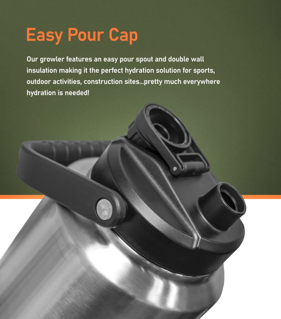 Details: Take your hydration to the max with our 1-Gallon (128oz) Growler + Tactical carrying bag. Constructed of durable 304 stainless steel and double-walled insulated to keep liquids hot for 24hrs / cold 48hrs. Includes a heavy-duty tactical bag (840D Nylon) with a padded shoulder strap and large storage compartments for phones, keys, wallets and more. The removable cap features a built-in carrying handle and leak-proof pouring cap with a threaded closure design. Your purchase comes backed by the Rangland Lifetime Guarantee. Makes for an awesome gift to that special dad or husband who seems to already have everything!