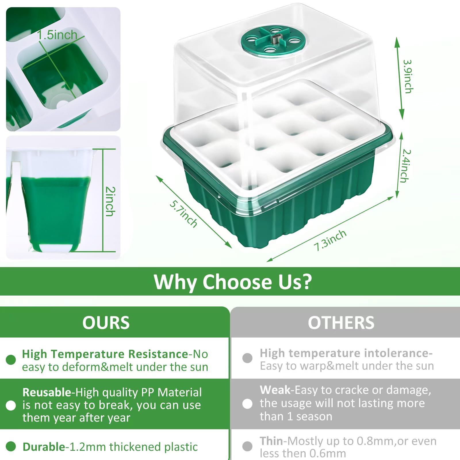 • 【Higher Adjustable Humidity Domes】: Heightened the height of the seedling starter tray' cover up to 3.9 inches, taller than most on the market, which can give the seedlings more room for growth better. Each transparent dome has 4 adjustable circular vents, can easily adjust the inner humidity and temperature by rotating the regulator, promote air circulation, help seed growth.