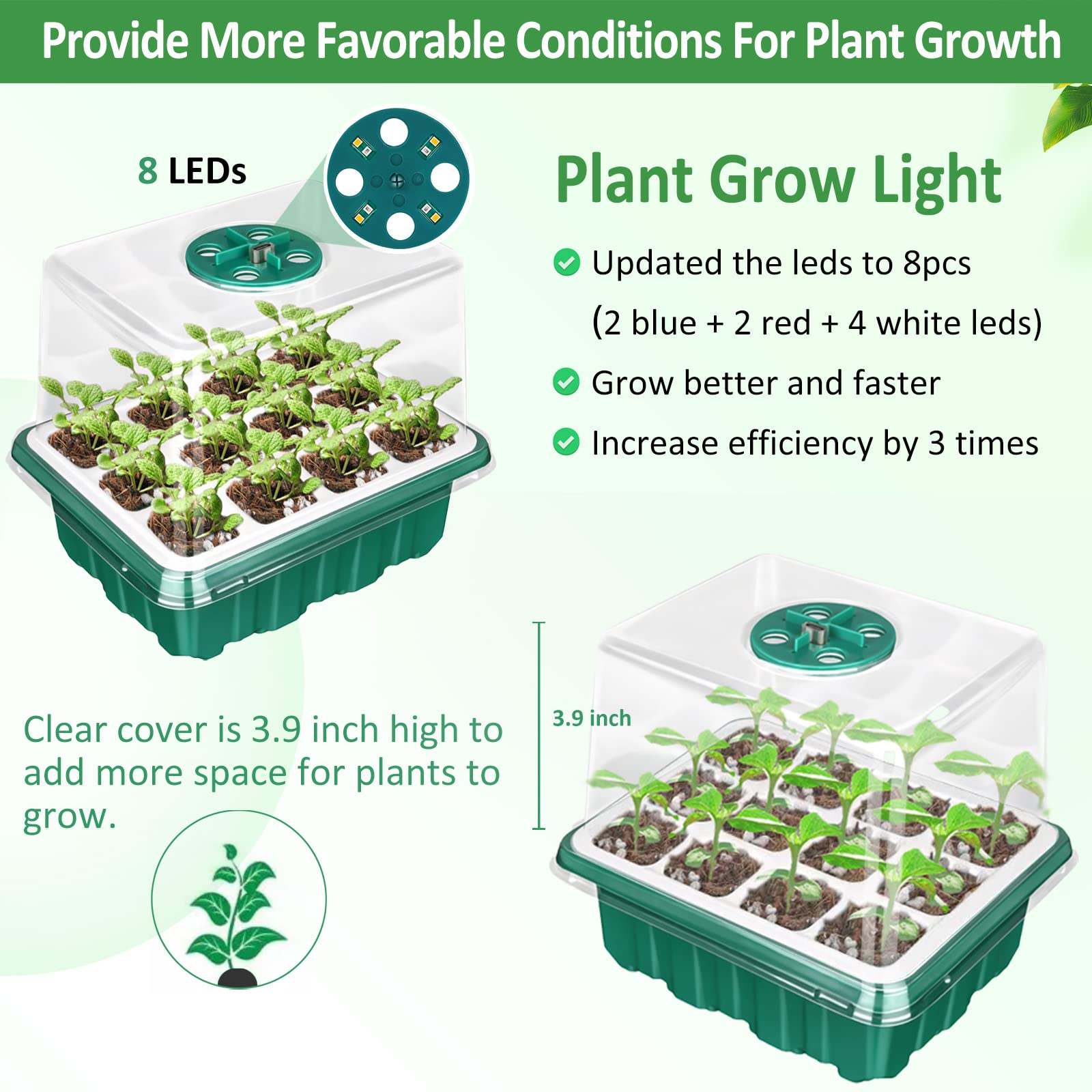 • 【Seed Starter Trays with Grow Lights】: Rarello seed starter tray is upgraded with full-spectrum 2 red+2 blue +4 warm white total of 8 grow light beads which is much more efficient for plant growth compared to regular only 4 white lights. Plant growth lights can artificially control the growing temperature, light quality, light intensity, and light cycle, so that plants are always in the best growing environment, day, night, or cold winter.
