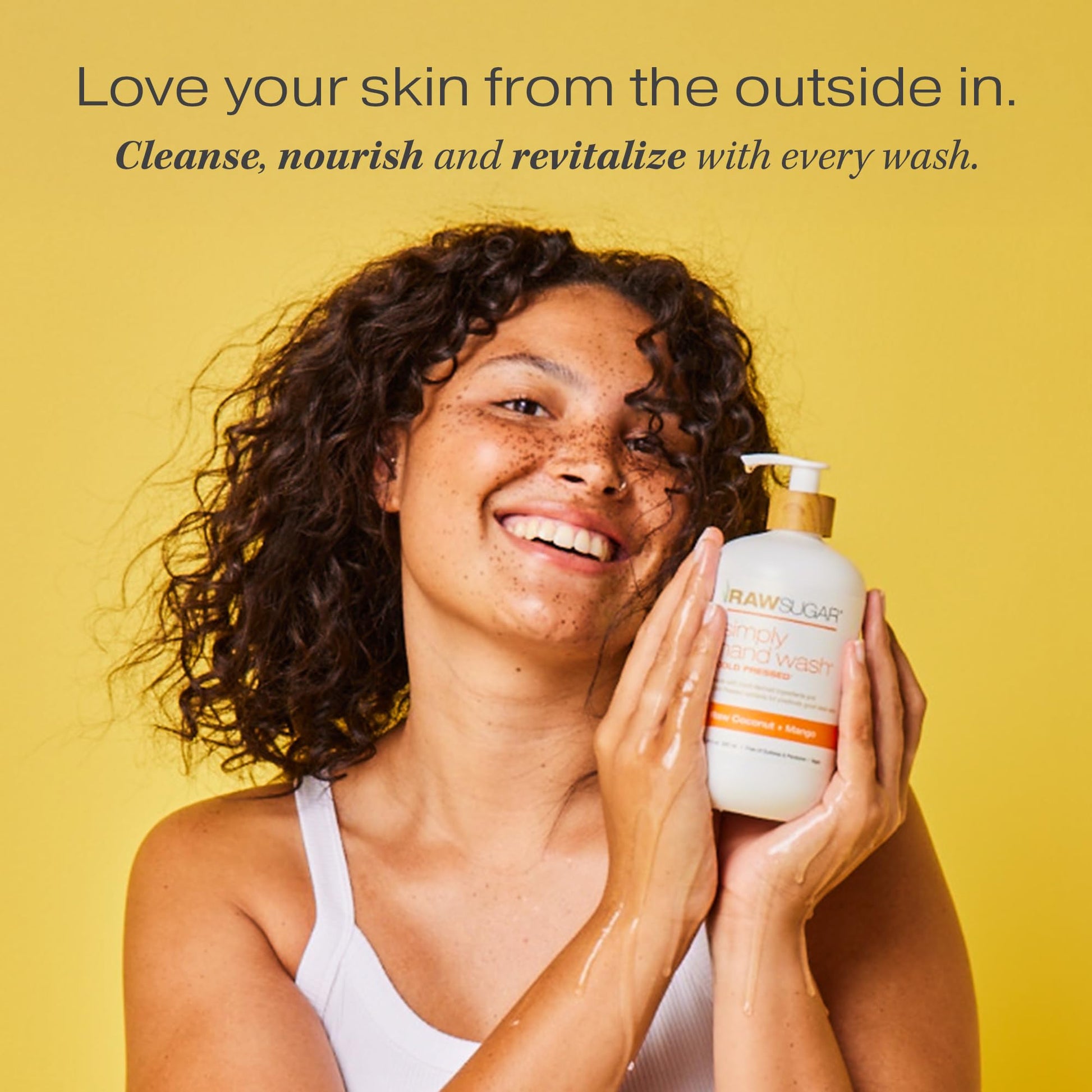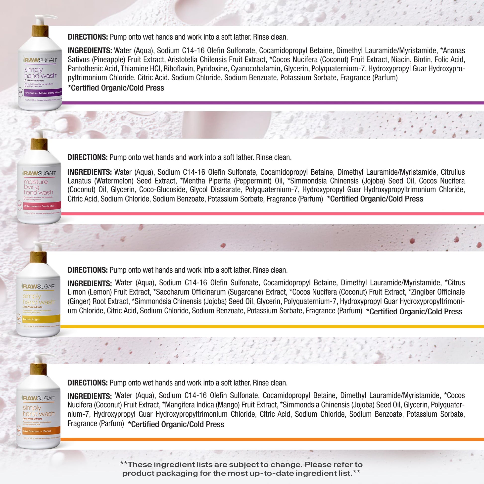 RAW SUGAR Hand Wash Variety Bundle - Lemon Sugar, Watermelon + Fresh Mint, Pineapple + Maqui Berry + Coconut & Raw Coconut + Mango, Formulated without Sulfates & Parabens (16.9 fl. oz, Pack of 4)