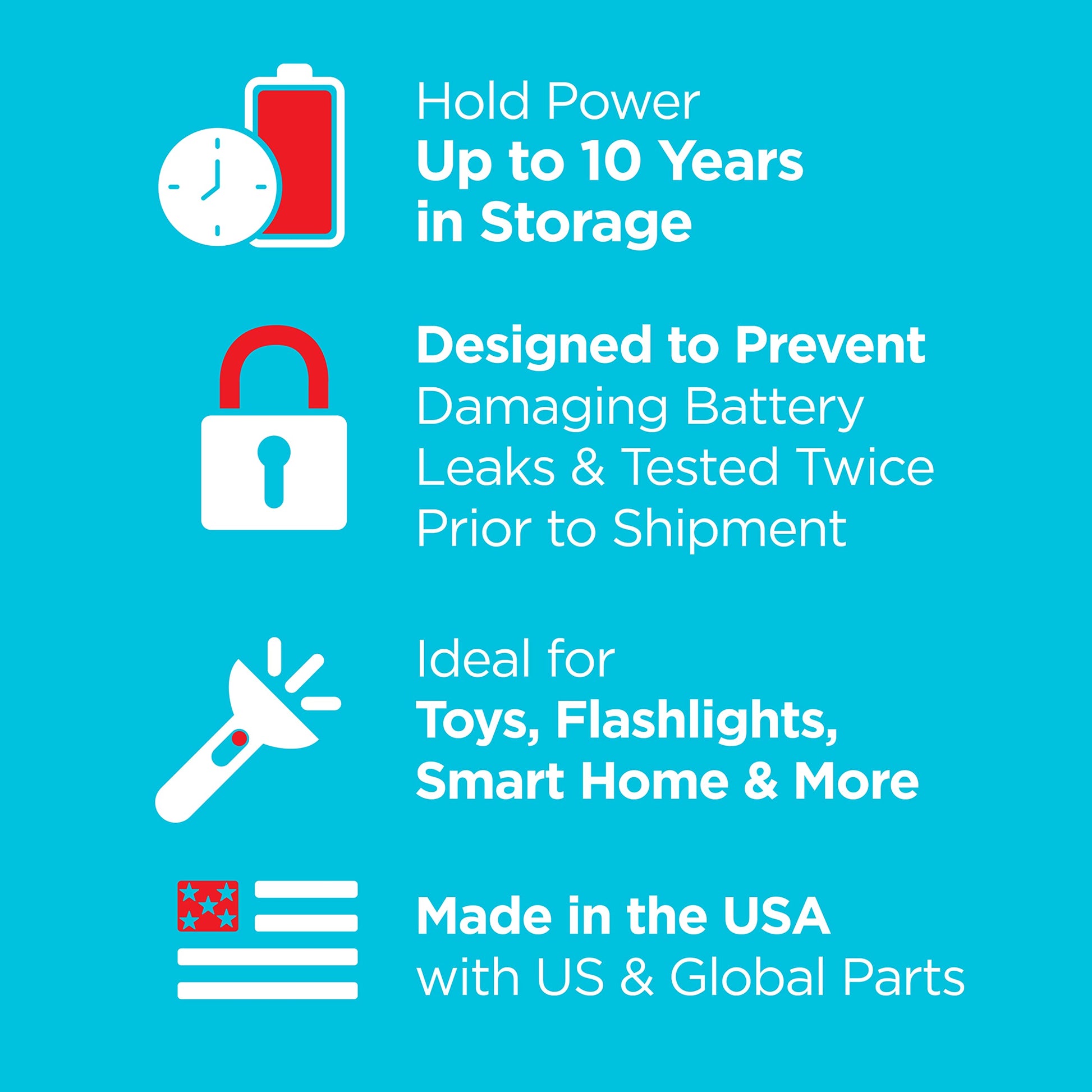 • These double A batteries are designed to prevent damaging leaks and made in the USA with US and global parts