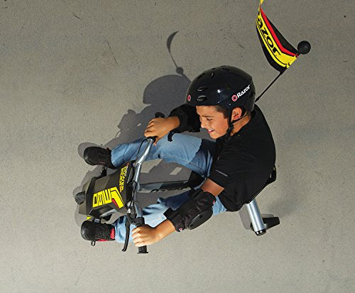 Blast into the future with the PowerRider 360 - the all-new, electric powered three-wheeler from Razor! With the push of a button, you're off - no pedaling required. Race at speeds up to 9 mph, cut full 360 degree spins, slide, even drift on PowerRider 360's high-performance duel inclined rear caster wheels. Features a chain-driven motor, with push button throttle, up to 40 minutes of continuous use, front, hand operated braking system, welded steel frame with moto-style double crown fork design, hi-impact pneumatic front wheel, rear, dual inclined casters for drifting and spinning action, rubber grips, and folding foot pegs. Also includes, a12V sealed lead acid rechargeable battery system with charger. 12 hour battery charge time. Recommended for ages 8 and older and will support a rider up to 120 pounds. The buyer and rider of the PowerRider 360 are responsible for knowing and obeying all local, state and federal regulations regarding the riding and use of all Razor electric vehicles and scooters.