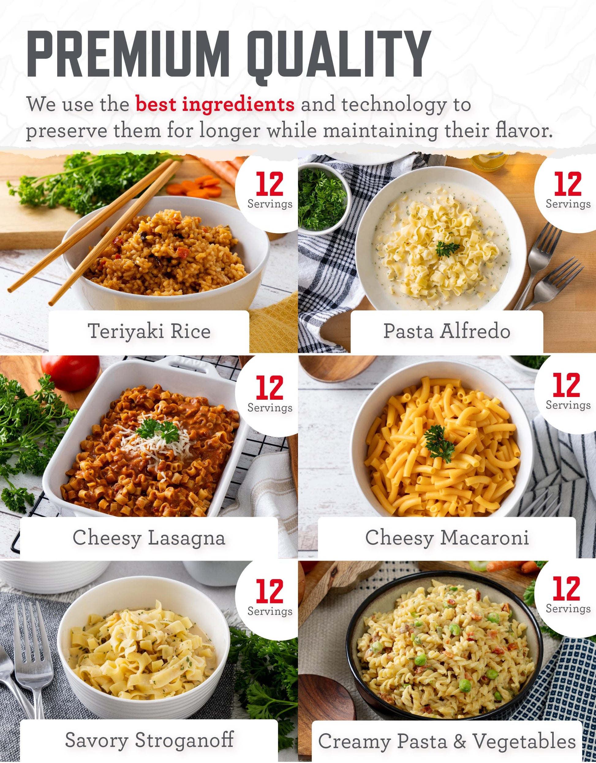 • ENJOY NUTRITIOUS MEALS: Our emergency supplies offer convenience and tasty, nutrient rich options, including Cheesy Macaroni, Lasagna, Teriyaki Rice, and Chicken Flavored Noodle Soup! Perfect for travel necessities, as well as home and kitchen use.