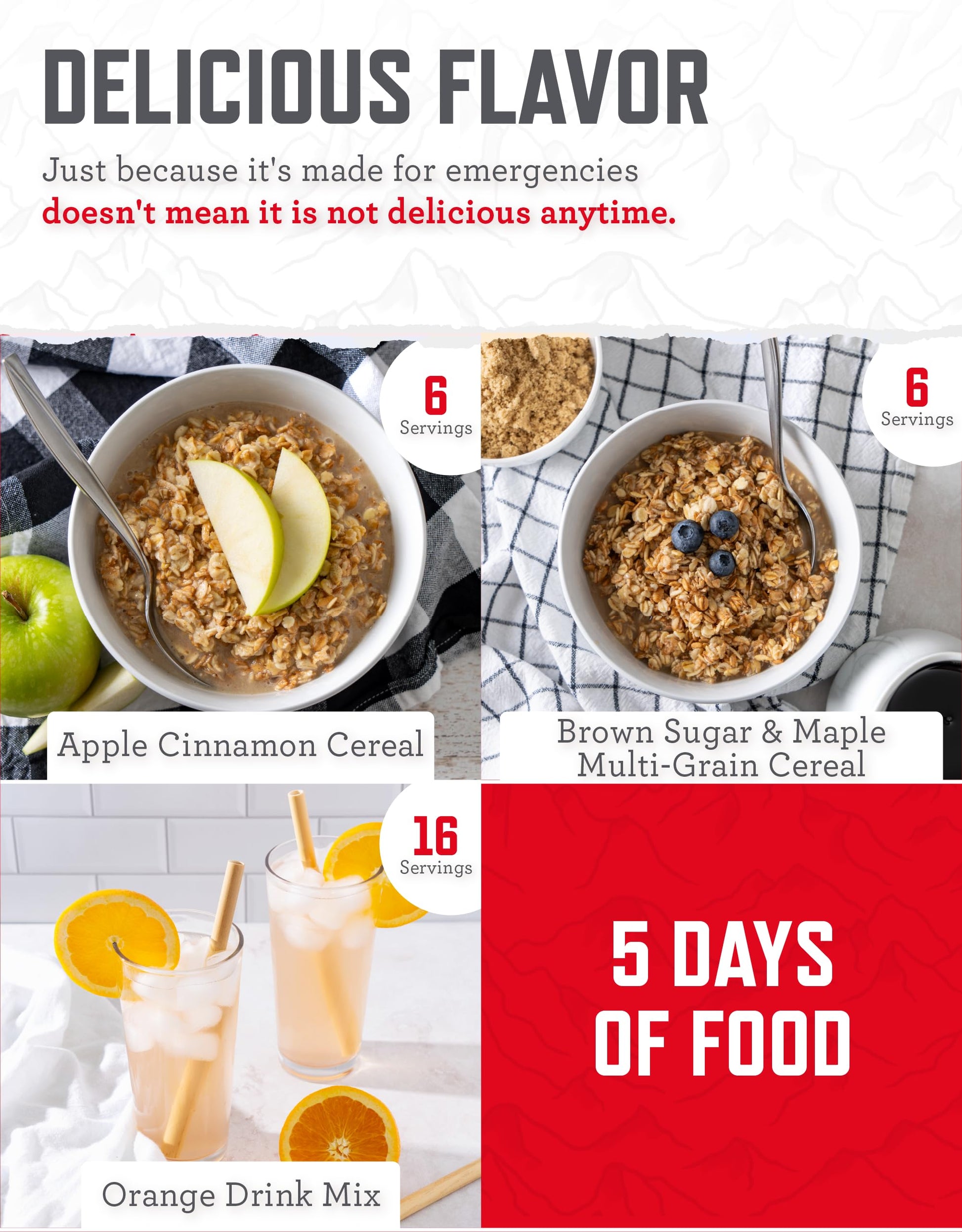 • ULTRA CONVENIENT: The split bucket lid is a game changer! It gives you quick access to your emergency food pouches and doubles as a tray and food holder for your servings. Just add water and enjoy a delicious premade meal! Yes, it's that easy!