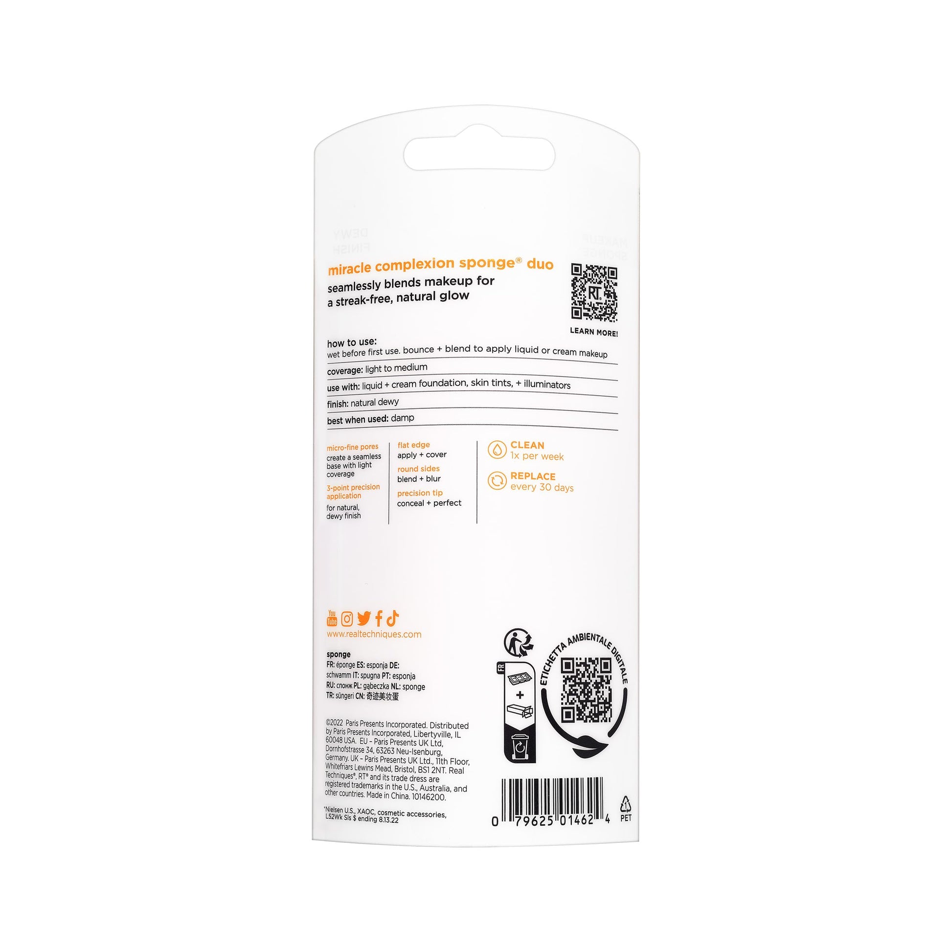 Details: The Real Techniques Miracle Complexion Sponge flawlessly blends liquid and cream products with ease for a streak-free, luminous glow. Our best-selling makeup blending sponge offers a natural, dewy finish, and its micro-fine pores help create a seamless base with light to medium coverage. Real Technique’s makeup sponge works best with liquid and cream makeup products such as foundation, skin tints, and illuminators. This makeup sponge has RT's unique 3-point application technique that makes blending products seamless. First use the flat edge of the makeup blender sponge to pack on product, then the precision tip to conceal, and finally, blend it all out with the rounded side. Use it damp for extra dewiness and let that inner glow shine through. The Miracle Complexion Sponge is easy to clean using our Real Techniques Brush + Sponge Cleansing Gel. It’s also 100% cruelty-free, vegan, and designed with revolutionary latex-free foam technology. We are Real Techniques, the brand of choice for all makeup users, no matter your level of expertise. Created in collaboration with leading makeup artists, we aspire to take the mystery out of choosing beauty tools so you can focus more time on putting your best face forward one blend at a time. From full makeup looks, to quick beauty hacks, RT brushes + sponges are exceptionally high quality for professional looking results every time. BUT… don’t be fooled by our affordable prices, RT tools are award-winning + purposefully designed because that’s what you deserve. Quality without compromise.