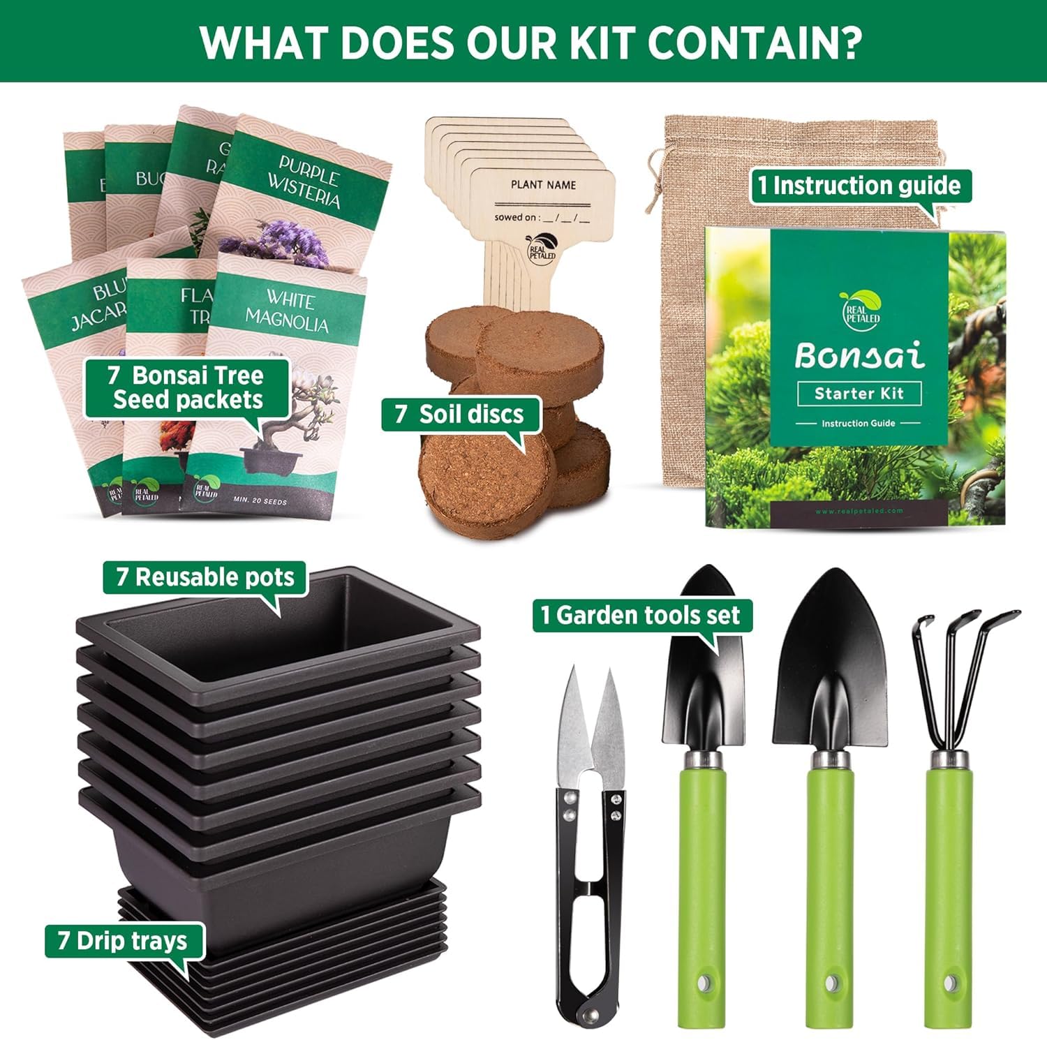 • Complete Bonsai Starter Kit: This complete bonsai tree starter kit includes everything you need for a rewarding and fun experience, such as 7 x different bonsai tree seeds, 7 x bonsai soil discs, 7 x reusable pots, 7 x plant markers, 1 x bonsai gardening tools Kit, 1x drawstring bag,1 x bonsai scissors, and step-by-step instructions.