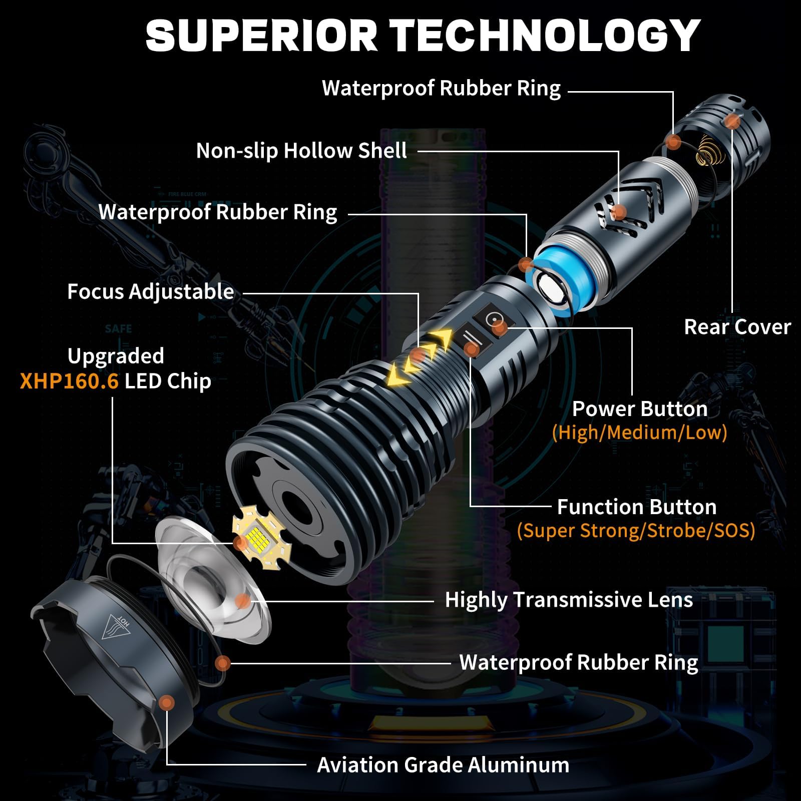 • 【Baibian BRIGHTEST FLASHLIGHT 5500.000 LUMENS 】With 16 beads, the super bright Flashlights powered by XHP160.6 LED chip is not only brighter than Flashlight with fewer beads such as the XHP90, XHP70 and XHP50, but also brighter than Flashlights with 36 beads, whose light is dispersed across 36 squares. Our Rechargeable LED Flashlights High Lumens can support a maximum output of 5500.000lumens, which is about 30 times brighter than a regular LED Flashlights.