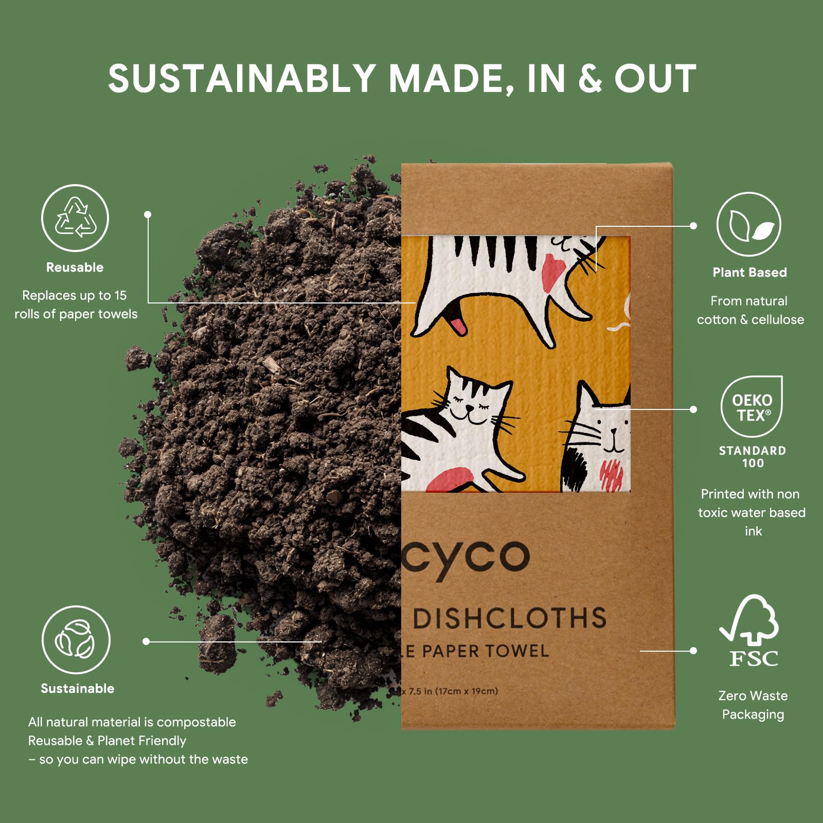 RECYCO Swedish Dishcloths for Kitchen | 6 Pack Cuddly Cats Washable Dish Rags | Cellulose Reusable Cleaning Paper Towels | Absorbent Counter Dish Cloth Sponge Kitchen Wipes, 8" L x 7" W