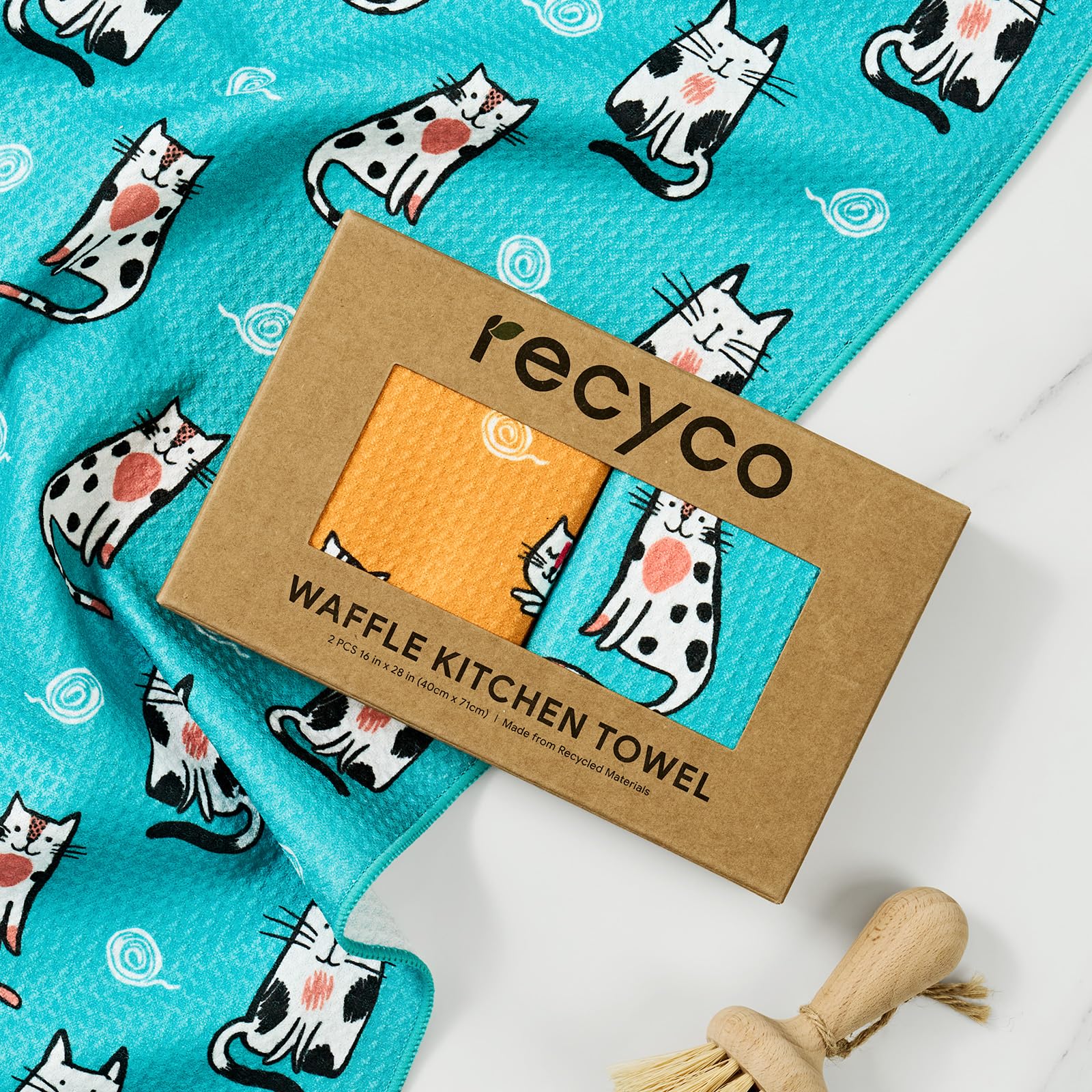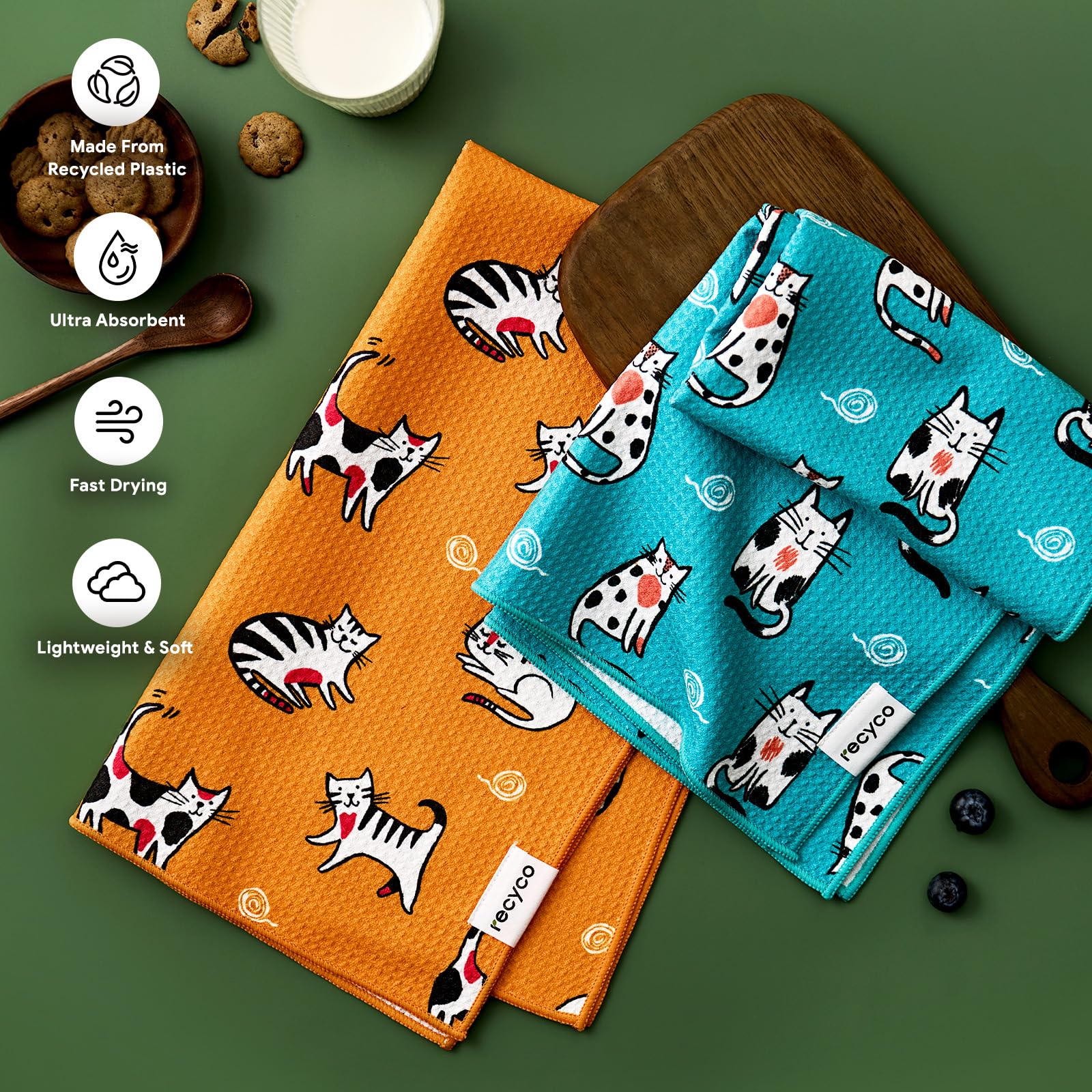 RECYCO Waffle Kitchen Towel Set of 2 - Quick Dry Microfiber Sustainable Dish Towels - Ultra Absorbent Reusable Cleaning Tea Towels - Lightweight Hand Towels,16”x 28”, Cuddly Cats