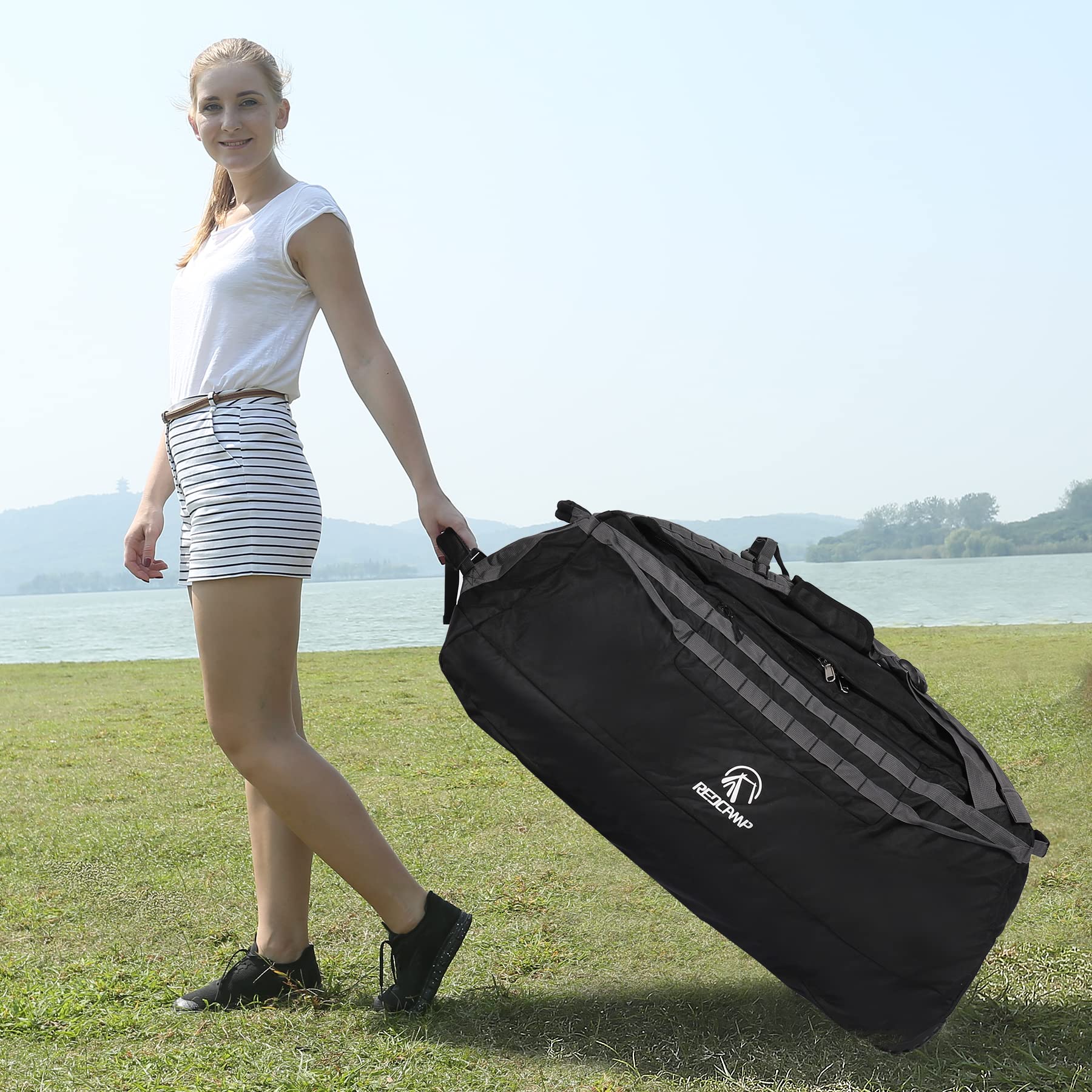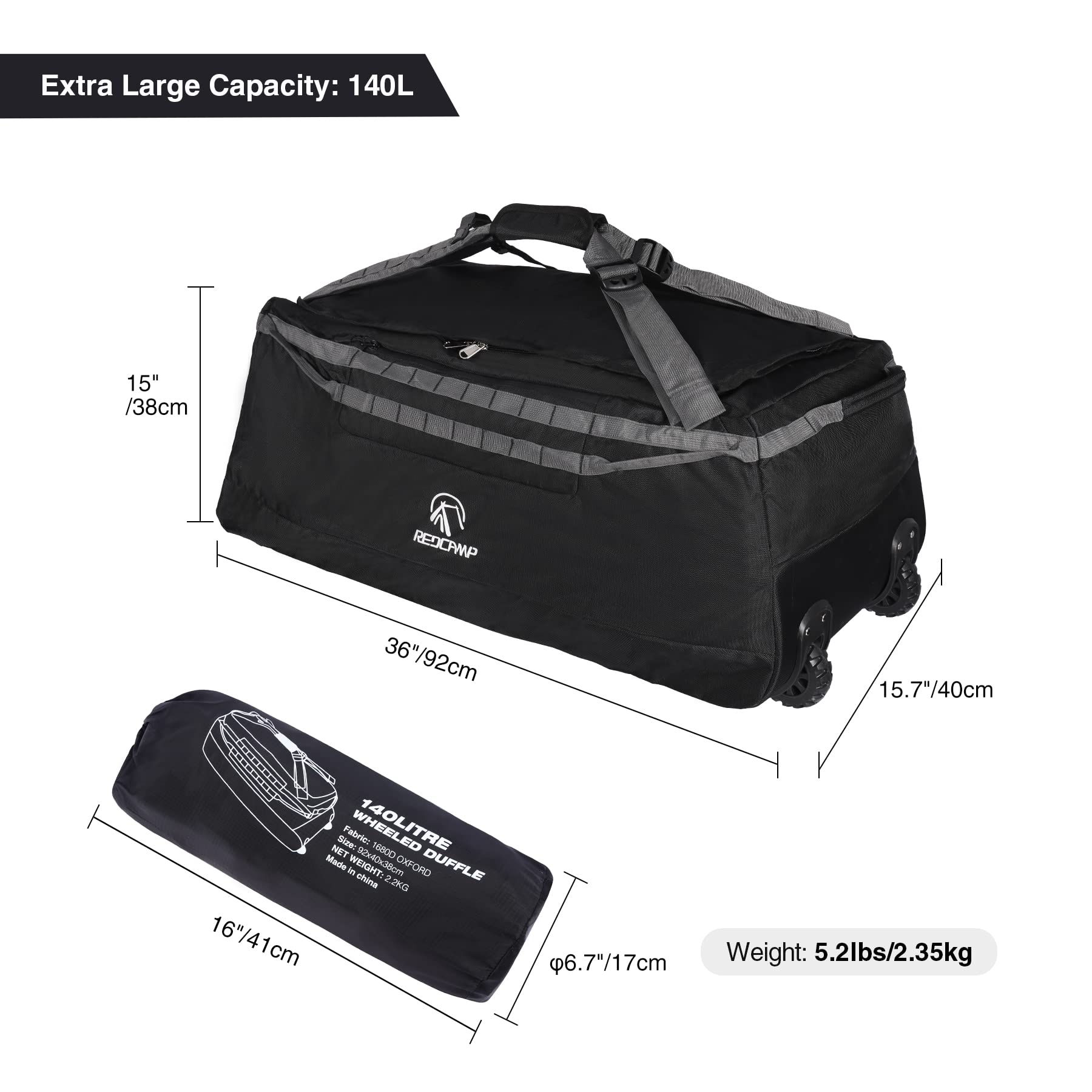 • Extra-Large Capacity: 140L large capacity, open size is 36x15.7x15”/92x40x38cm. Take all your essentials with Redcamp extra large wheeled travel bag