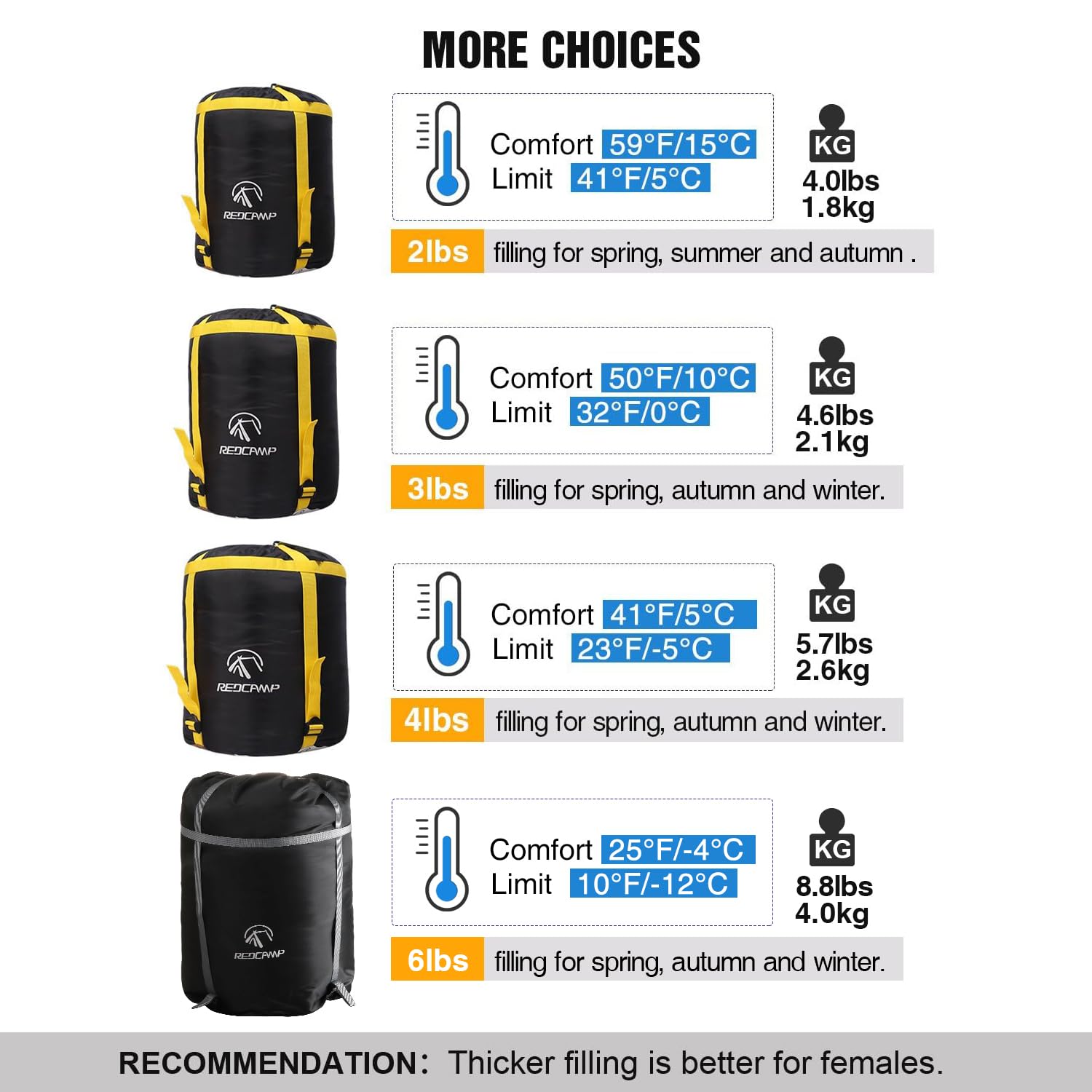 • Temperature Range: 2lbs filling 80% cotton lined adult sleeping bag is comfort in 59°F/15°C and fits temperature range 50-77°F/10 - 25°C.3lbs filling sleeping bags is comfort in 50°F/10°C and fits temperature range 41-68°F/5-20 °C. 4lbs filling sleeping bags is comfort in 41°F/5°C, and fits temperature range in 32-59°F/0 - 15°C. Females are recommended to choose the thicker sleeping bags.
