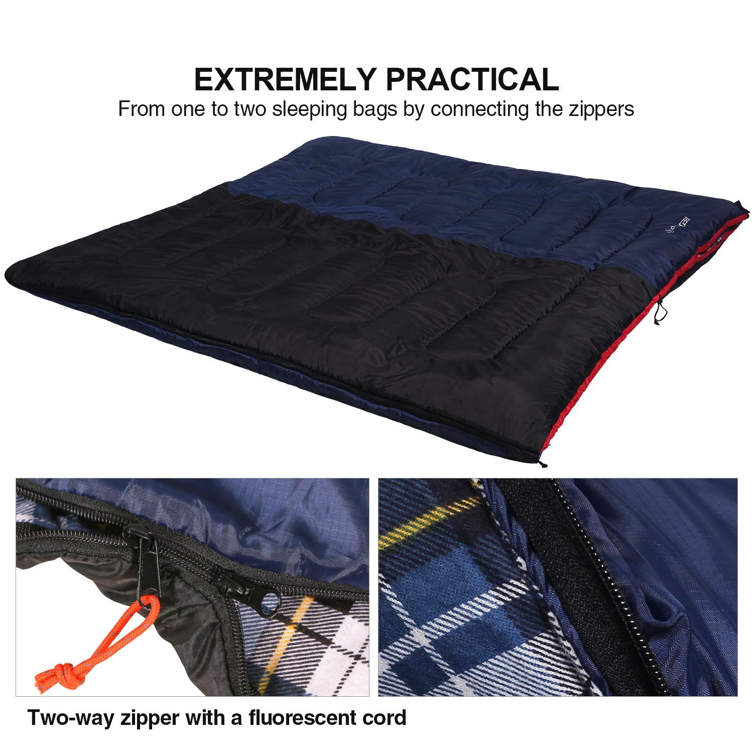 • Reverse Zipper: 2-way zippers that right or left-hand zippers allow for 2 flannel sleeping bags for camping to be attached together.