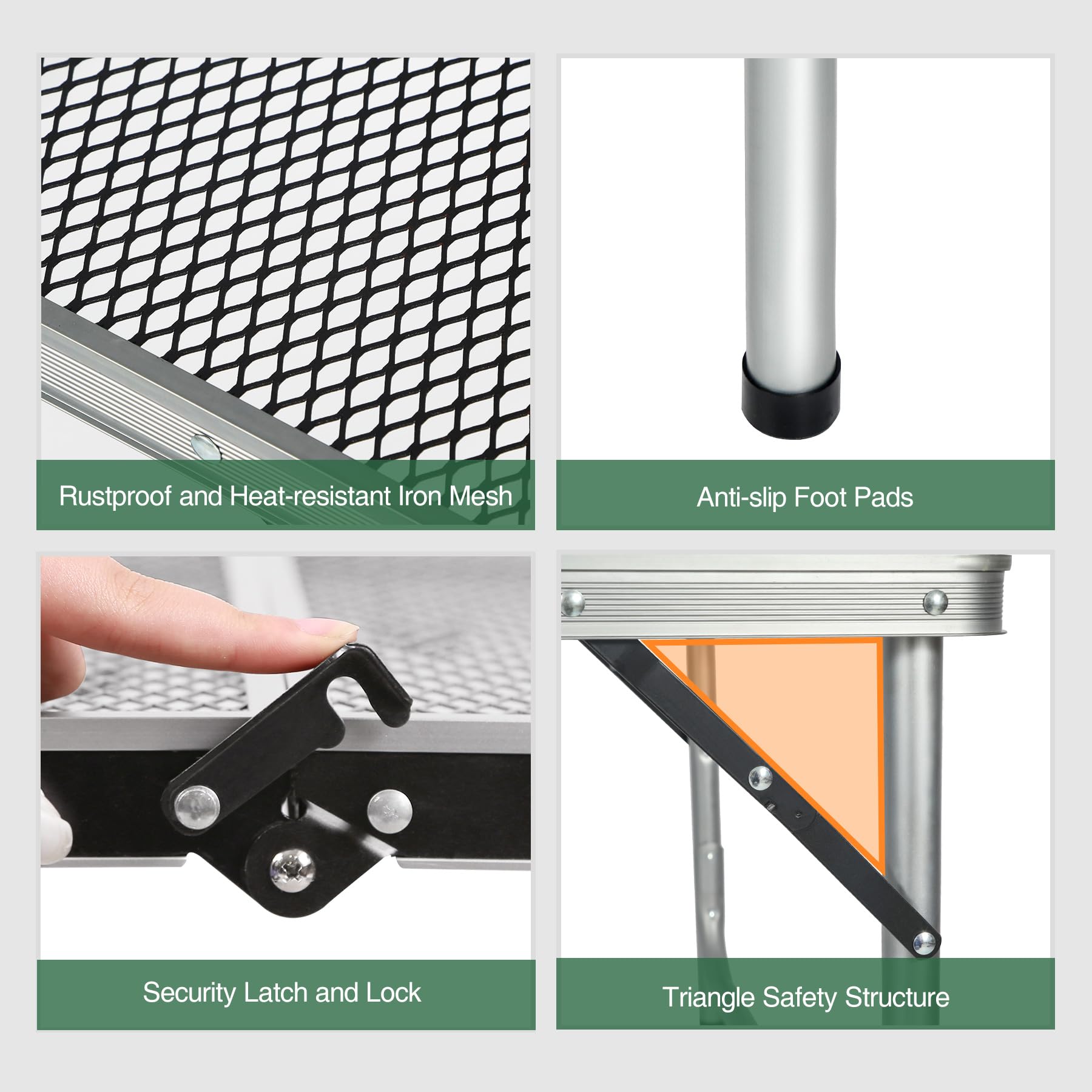 • High strength coated & heat resistant iron mesh (tabletop) and thicker aluminum alloy frame (diameter 25mm). X-shape side support and secure latch to ensure stablity.