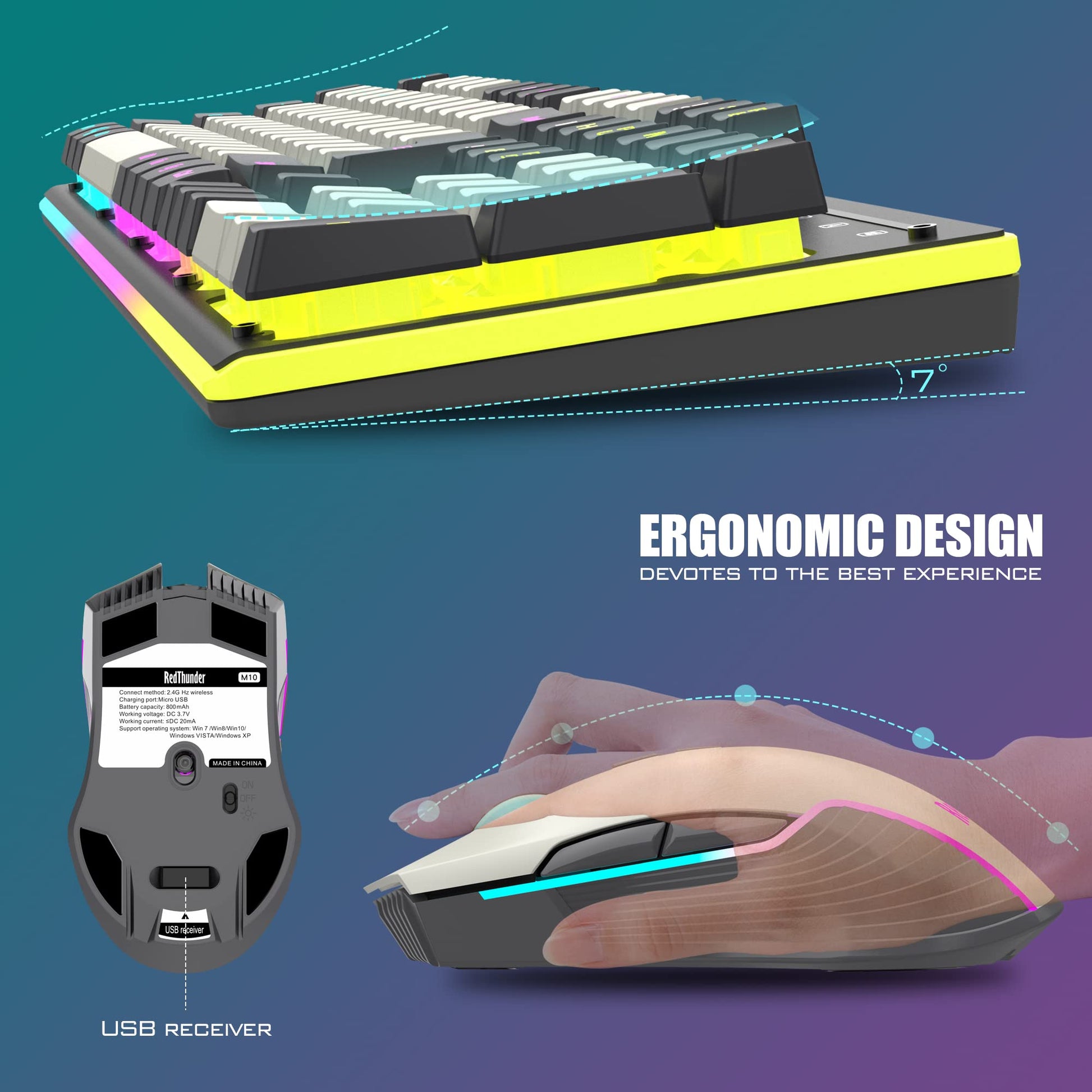 RedThunder K10 Wireless Gaming Keyboard and Mouse Combo, LED Backlit Rechargeable 3800mAh Battery, Mechanical Feel Anti-ghosting Keyboard + 7D 3200DPI Mice for PC Gamer (White-Gray)