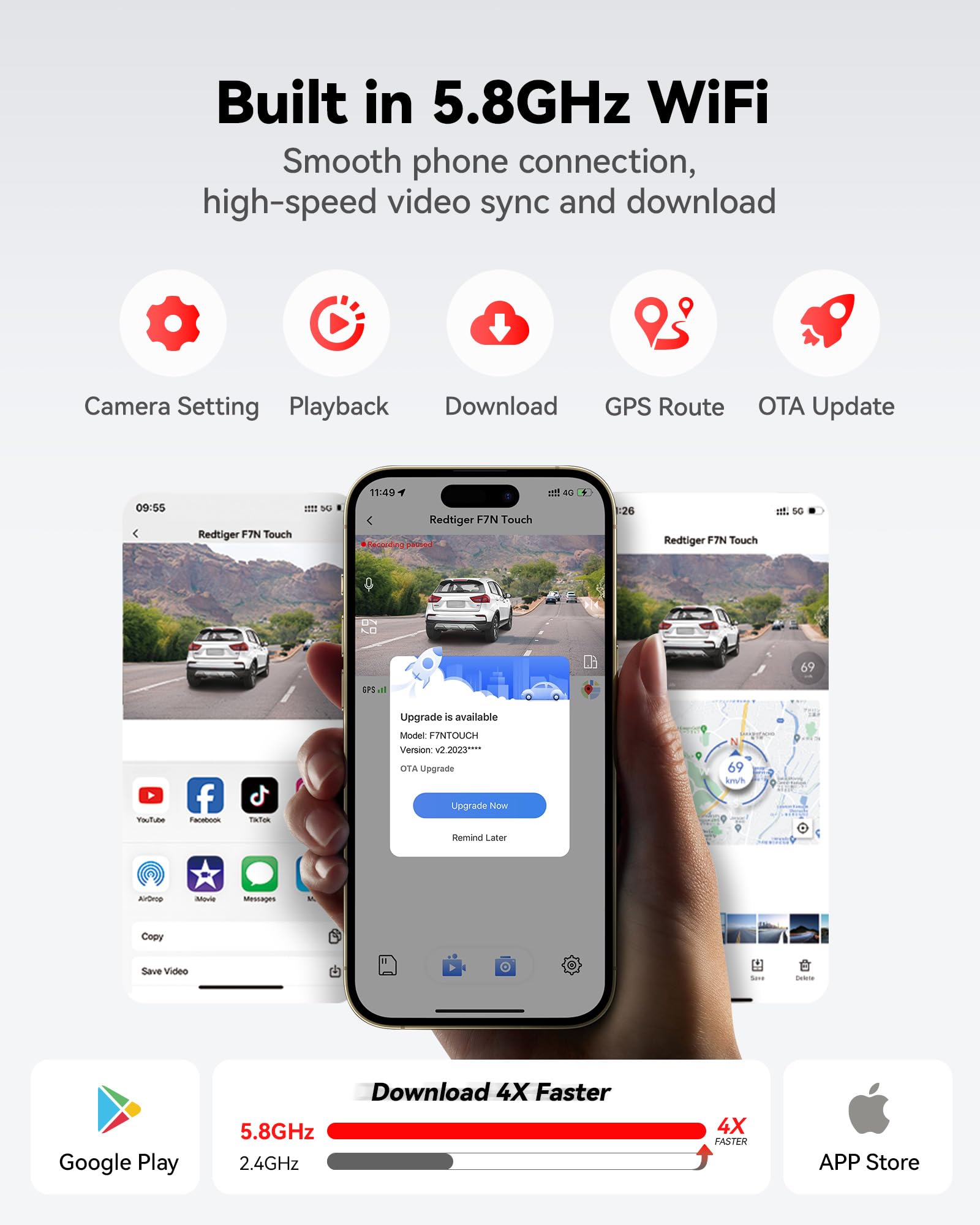• [Voice Control & Touch Screen] F7NTOUCH dashcam features voice commands, allowing for hands-free control of your 4K car camera, which enhances safety by minimizing distractions. The dual camera dash cam also has smart touchscreen that can lock emergency video, turn on wifi, and capture scenery with one click. Redtiger also retains the buttons, multiple control methods are integrated.