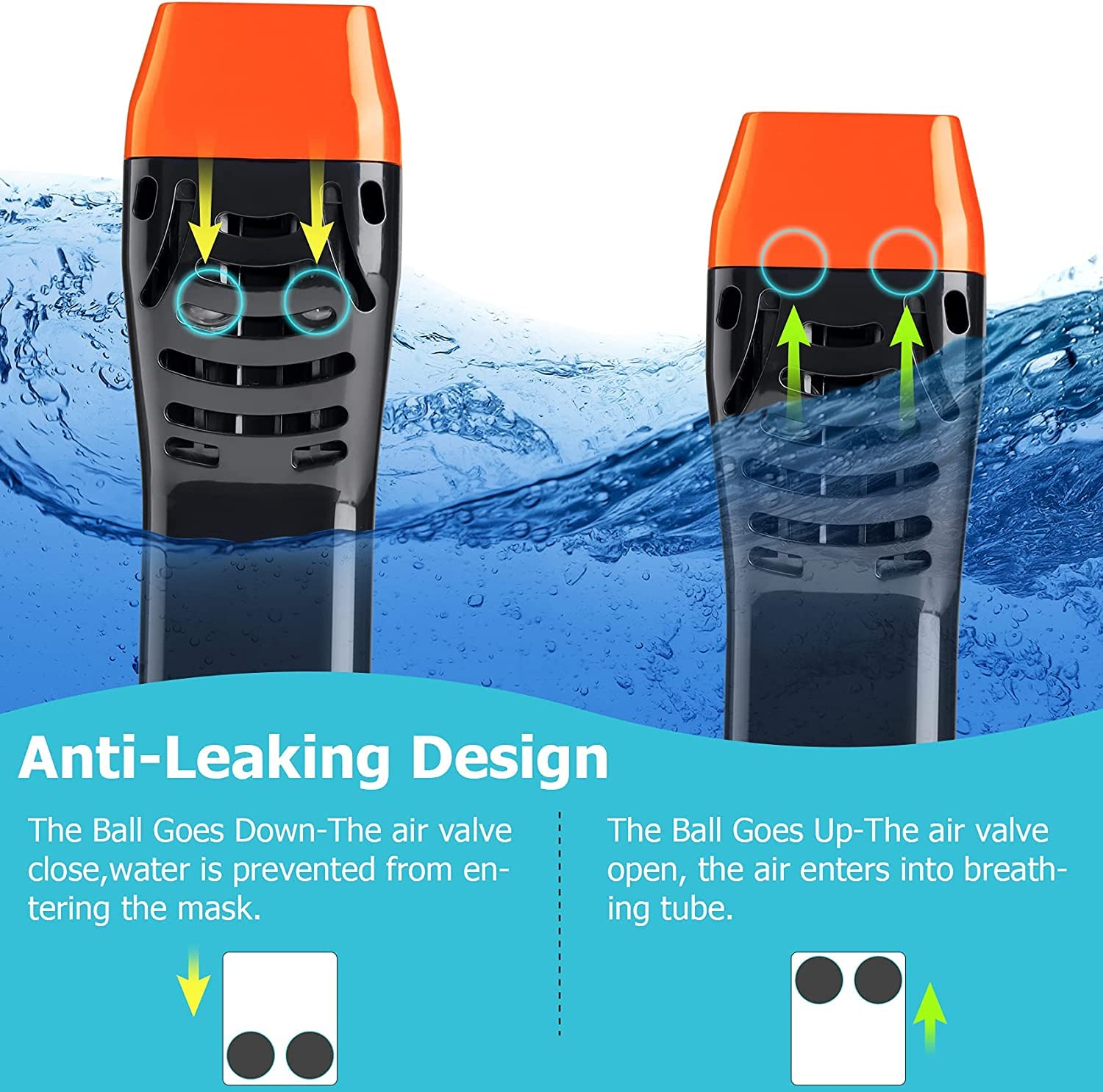 • 【Anti-Leaking Design】 Above water, the ball goes Down-The air valve close,water is prevented from entering the mask. Under water ball goes Up-The air valve open, the air enters into breathing tube. This design will stop water entering through top of snorkel mask into your mouth.