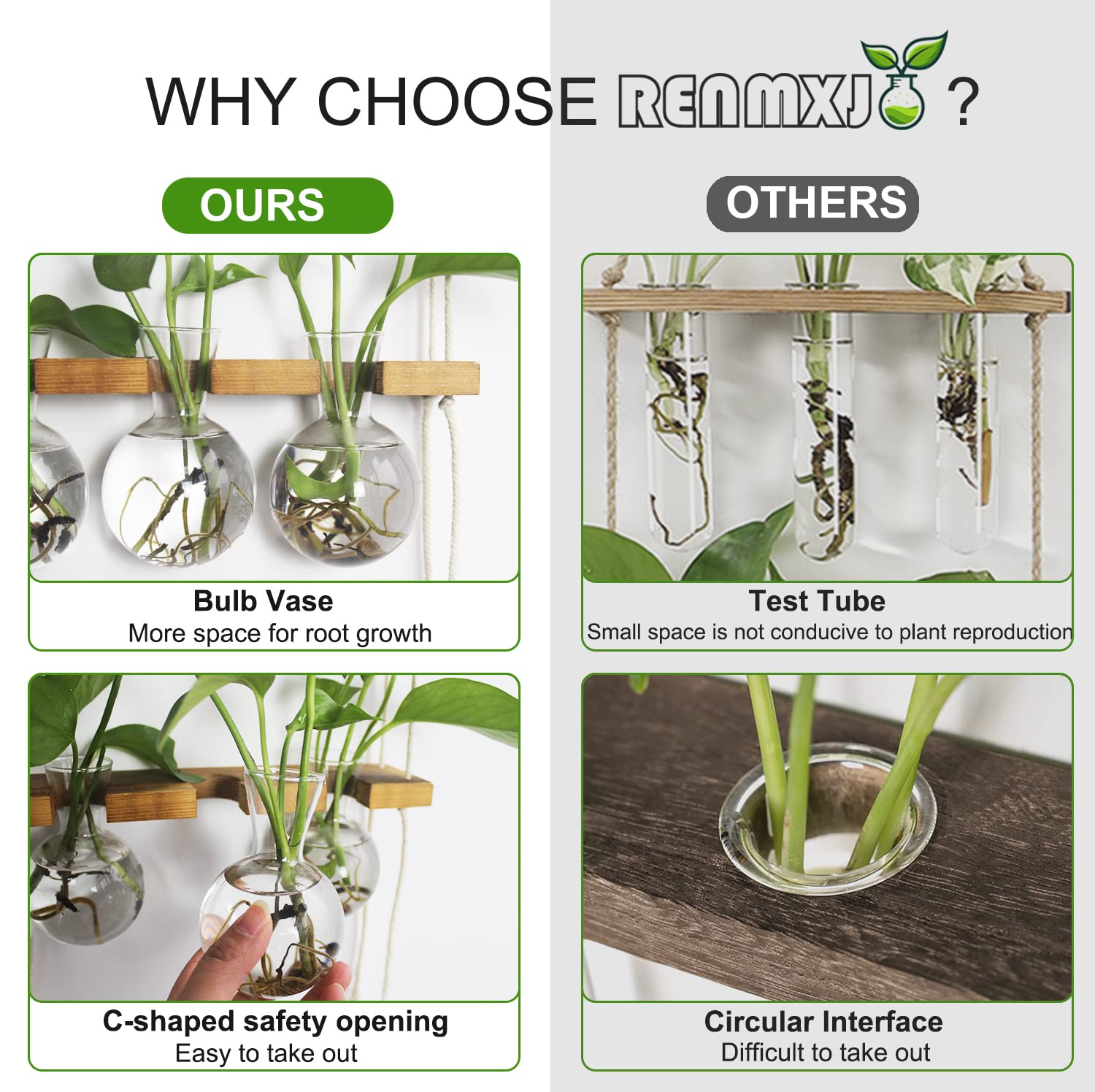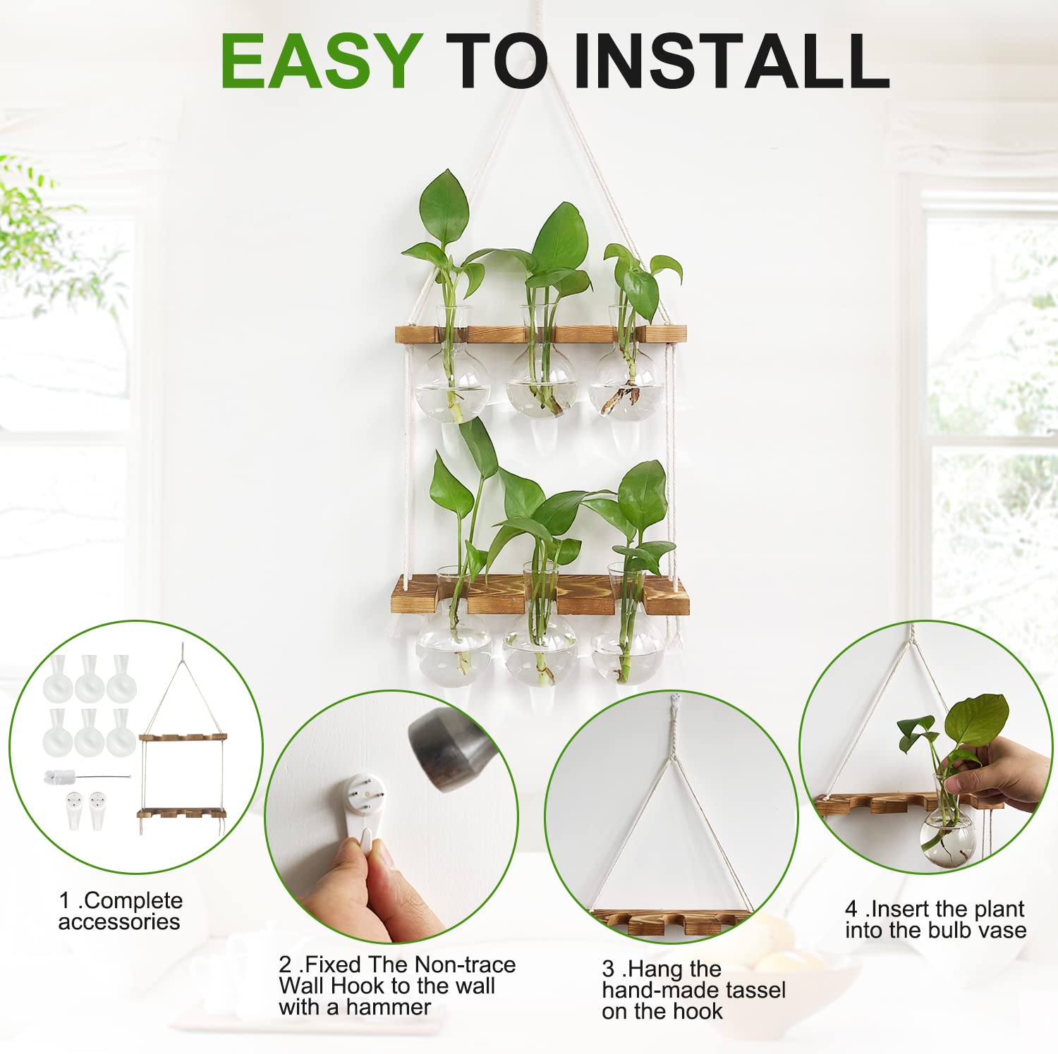 • Easy to Clean and Change Water: The C-shaped safety opening is used to stabilize the bulb vase which is easy to take down for cleaning water change and plant replacement without taking the whole thing off the wall. The bulb vase has more space which is conducive to root growth.You can easily see the roots growing and condition of the water and is suitable for breeding cuttings of different sizes