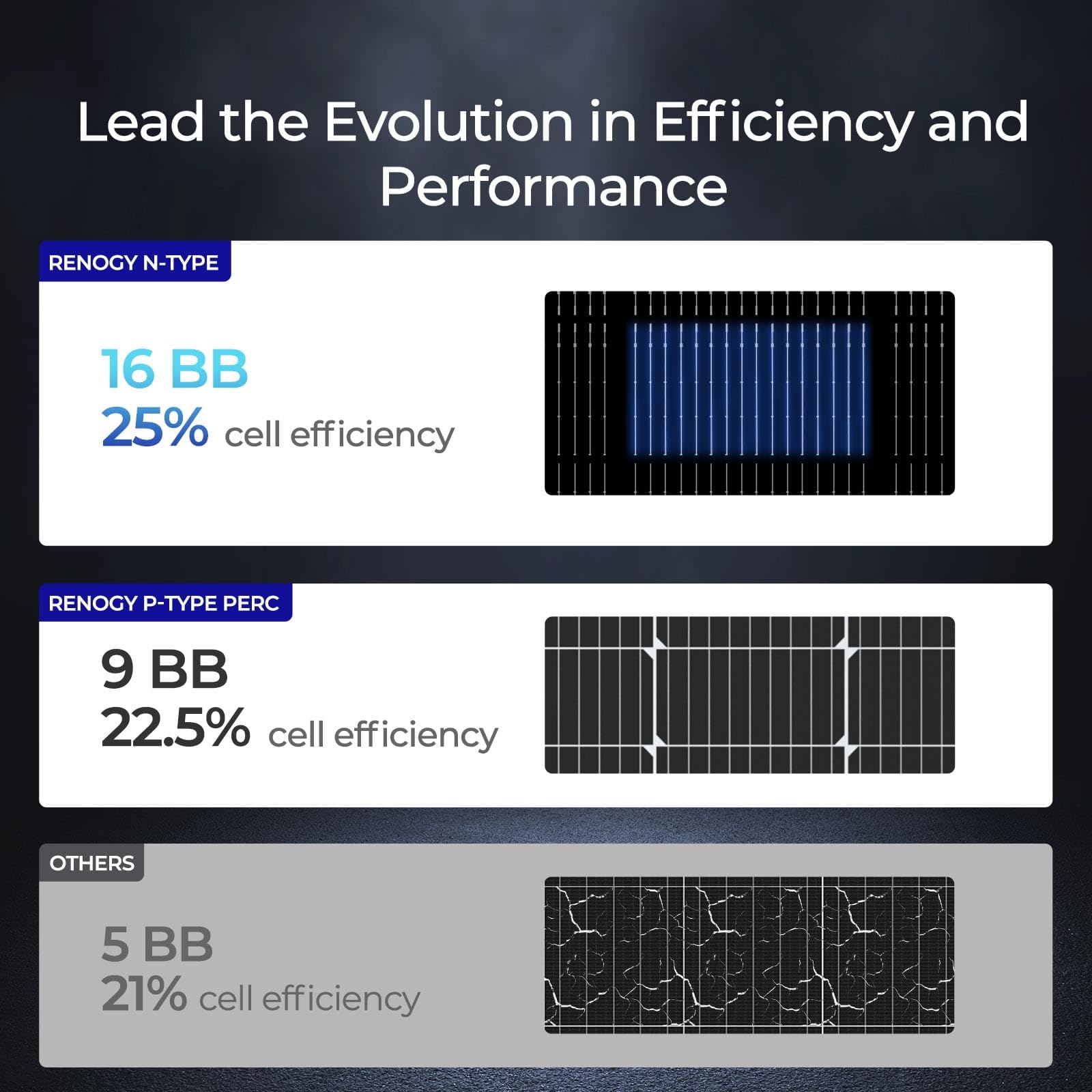 • Unmatched Cell Efficiency - Featuring advanced N-Type solar cells with 16BB technology, renogy shadowflux solar panels achieve 25% efficiency. The 400 watt solar panel enhances photoelectric conversion while reducing hot spots and micro-cracks, ensuring longer lifespan and superior performance.