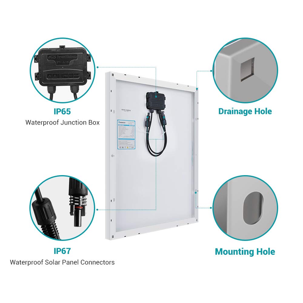 • Pre-drilled holes included for grounding. Compatible with different Renogy mounting systems such as Z-Brackets, Pole Mounts and Tilt Mounts.