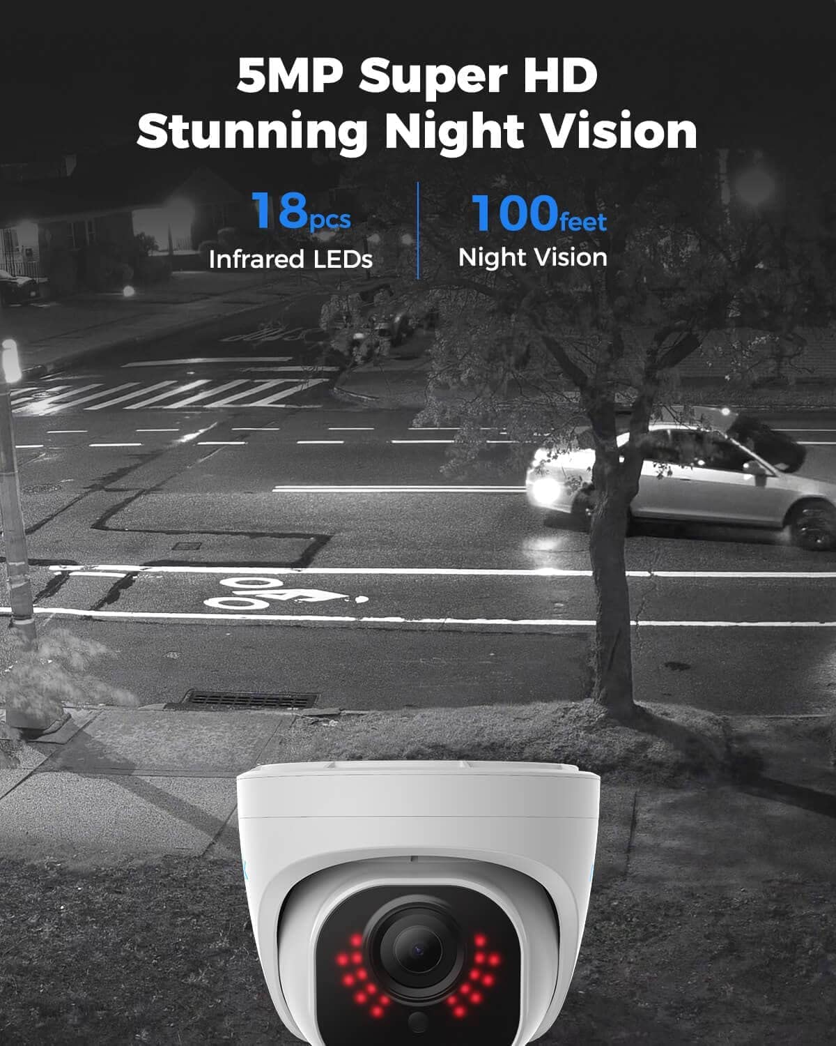 • CAPTURE CRIME FROM DETAILS: Discover potential crime has never been so easier with superior 5MP HD. With advanced IR lights, you can see up to 100ft in the dark, helping to protect your property and loved ones even at night.