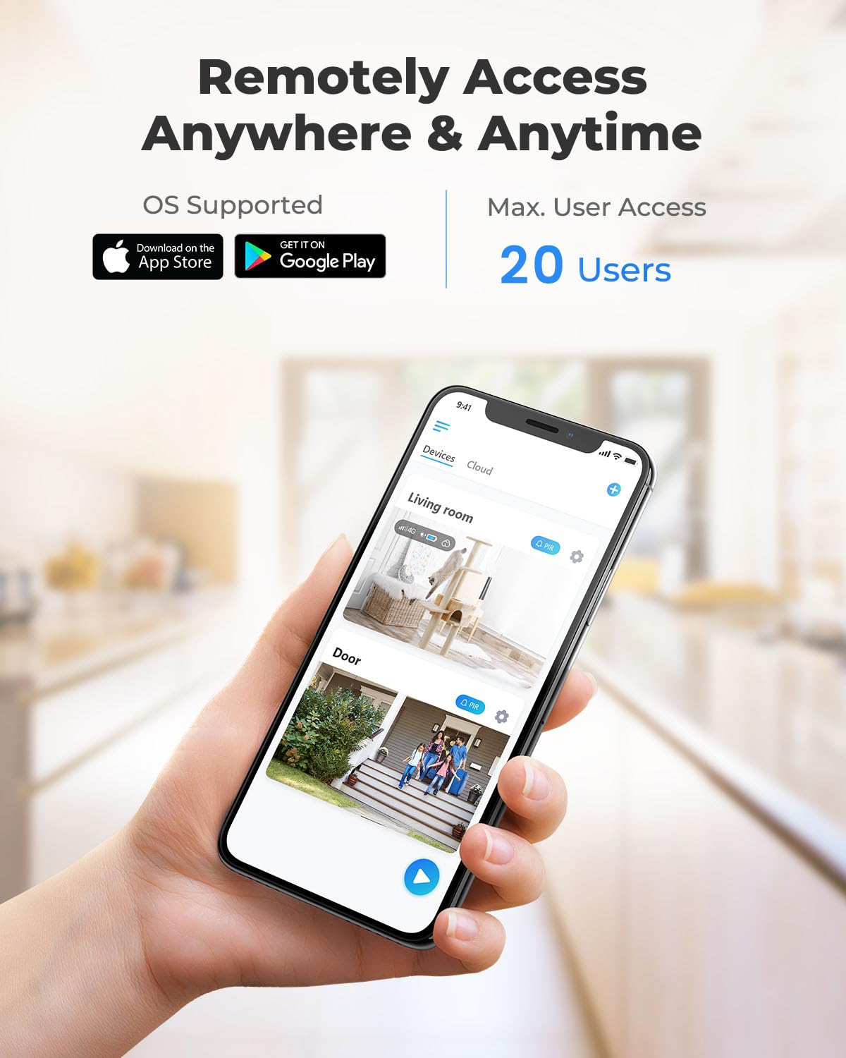 • HDD Storage and Remote Playback – Including a pre-installed 2TB HDD, videos can be recorded and stored for ten days without overwriting occurring. Users can add one additional external 6TB HDD via the camera’s e-SATA port. With the free Reolink app, all videos can be played back through your smart device anywhere, anytime.