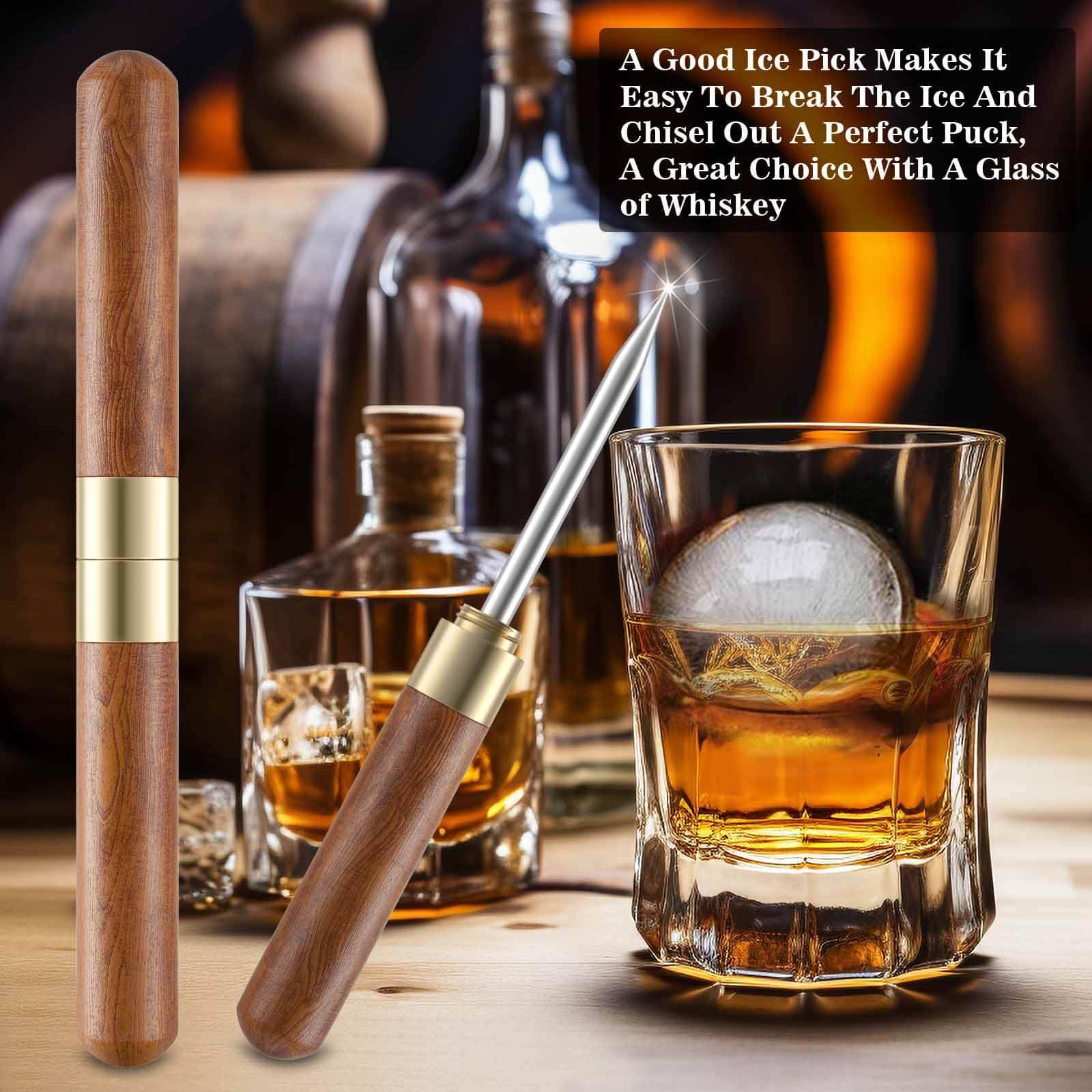Ice pick with cover, stainless steel ice chipper, heavy duty ice hammer for breaking ice cubes, ice layer, and frozen food, wooden handle, for kitchen, bar, picnic, and camping The ice picks are suitable for bartenders to break ice, make various shapes for ice cubes, remove ice cubes in the refrigerator The product is made of high quality pear wood, brass and food grade stainless steel, sturdy and durable, not rust and corrosion resistance This ice pick has a cover that can cover the tip when not in use, preventing scratches or injuries This ice pick is 7 inches long, just enough to hold in your hand without being too long or too short, and the handle has a non-slip finish, which prevents it from slipping when in operation This ice pick is easy to use, just align the tip with the ice or frozen item, and hit it with force, breaking them into pieces. please be careful when using it, and avoid hurting yourself or others.