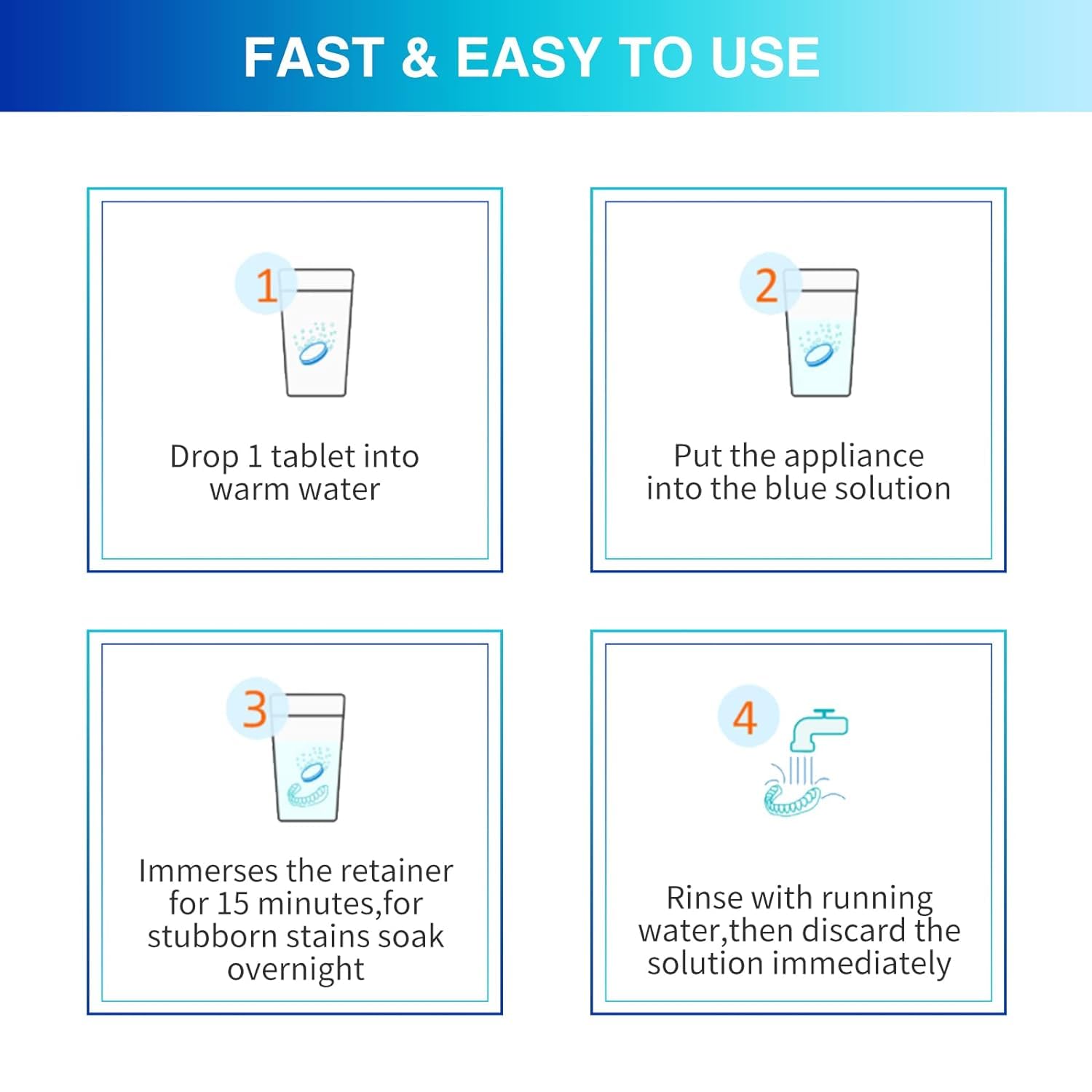 • QUCIK DISSOLVE: Our cleaning tablets adopt Reactive Oxygen Micromolecular Osmosis Technology, provide comprehensive cleaning and deep desccaling for your retainers, dentures or other dental appliances with no harm