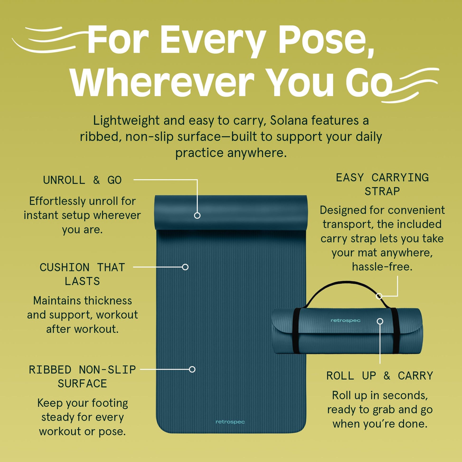 • DURABLE & PORTABLE: Solana's thick, durable material allows for everyday use, regardless of the intensity of your exercise. Solana comes equipped with a nylon carrying strap so you can easily transport it from your home practice to studio salutations.