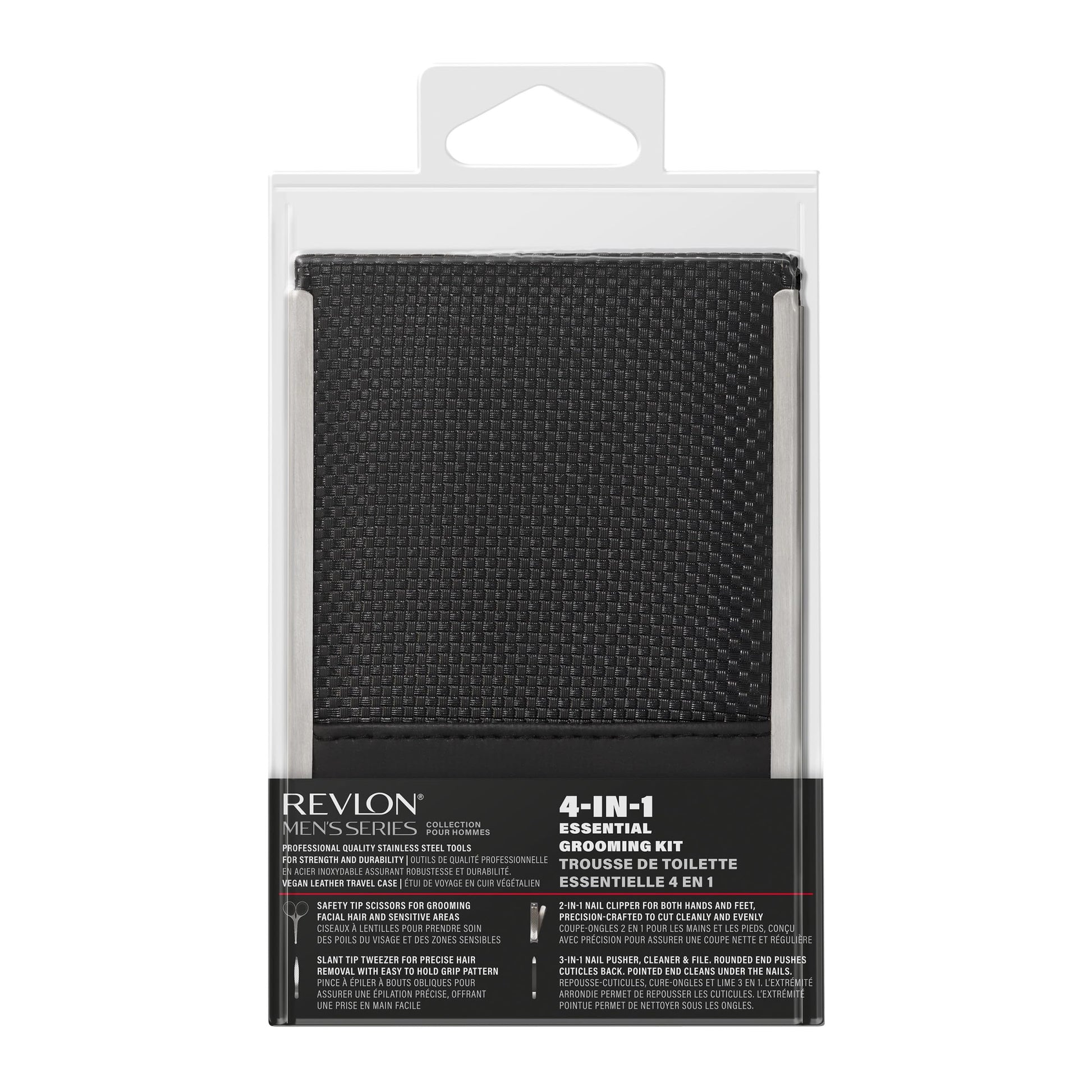 Details: It’s in your hands—cause you’re a pro. NEW Revlon Men’s Series, the #1 Men’s Tools in the U.S.* help you accomplish any grooming goal you might have. The Men's Series Essential Grooming Kit is an on-the-go, 4-in-1 grooming kit designed for men’s hands, featuring one premium vegan leather travel case and four professional quality stainless steel tools for strength and durability. Includes Revlon® Men’s Series Safety Scissors, Dual-Ended Nail Clipper, Tweezer and 3-in-1 Nail File. *Revlon Consumer Products Corporation’s calculation based in part on data reported by Circana, LLC, through its OmniMarket Service of Total US Multi-Outlet for Men’s Beauty Tool Category for the 52-week period ending 11-24-2024 using Revlon’s custom definitions.