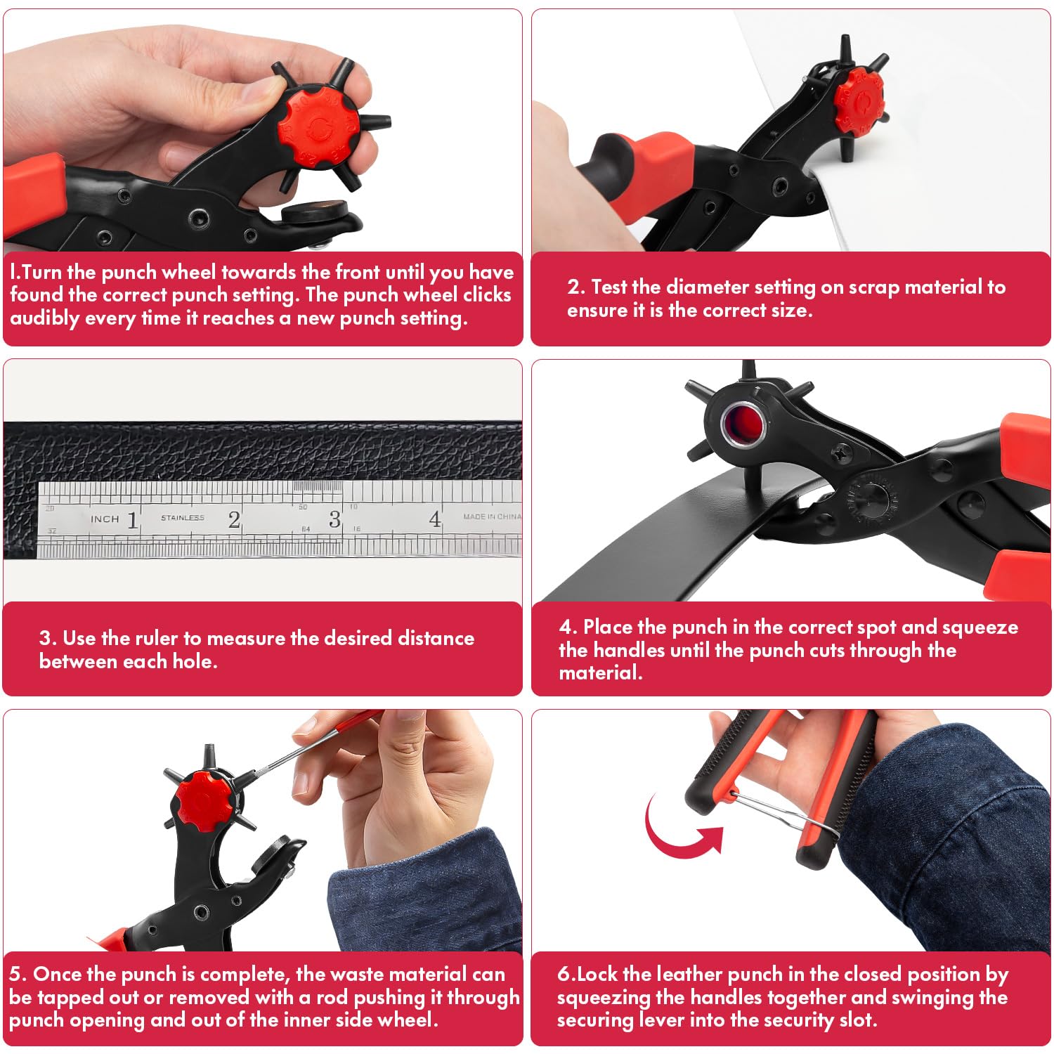• 【Multi-function】 Ideal for use on a variety of surfaces. It is an awesome tool. The punch plier is commonly used for punching round holes in leather, belts, plastic, rubber, canvas, fabric, cardboard, saddles, and similar materials; especially useful as a leather hole punch. It has 6 different sizes, which is perfect for home hobby or commercial use. Hole size dimensions: 2mm, 2.5mm, 3mm, 3.5mm, 4mm and 4.5mm. And the six tapers are very sharp to meet the maximum demand.