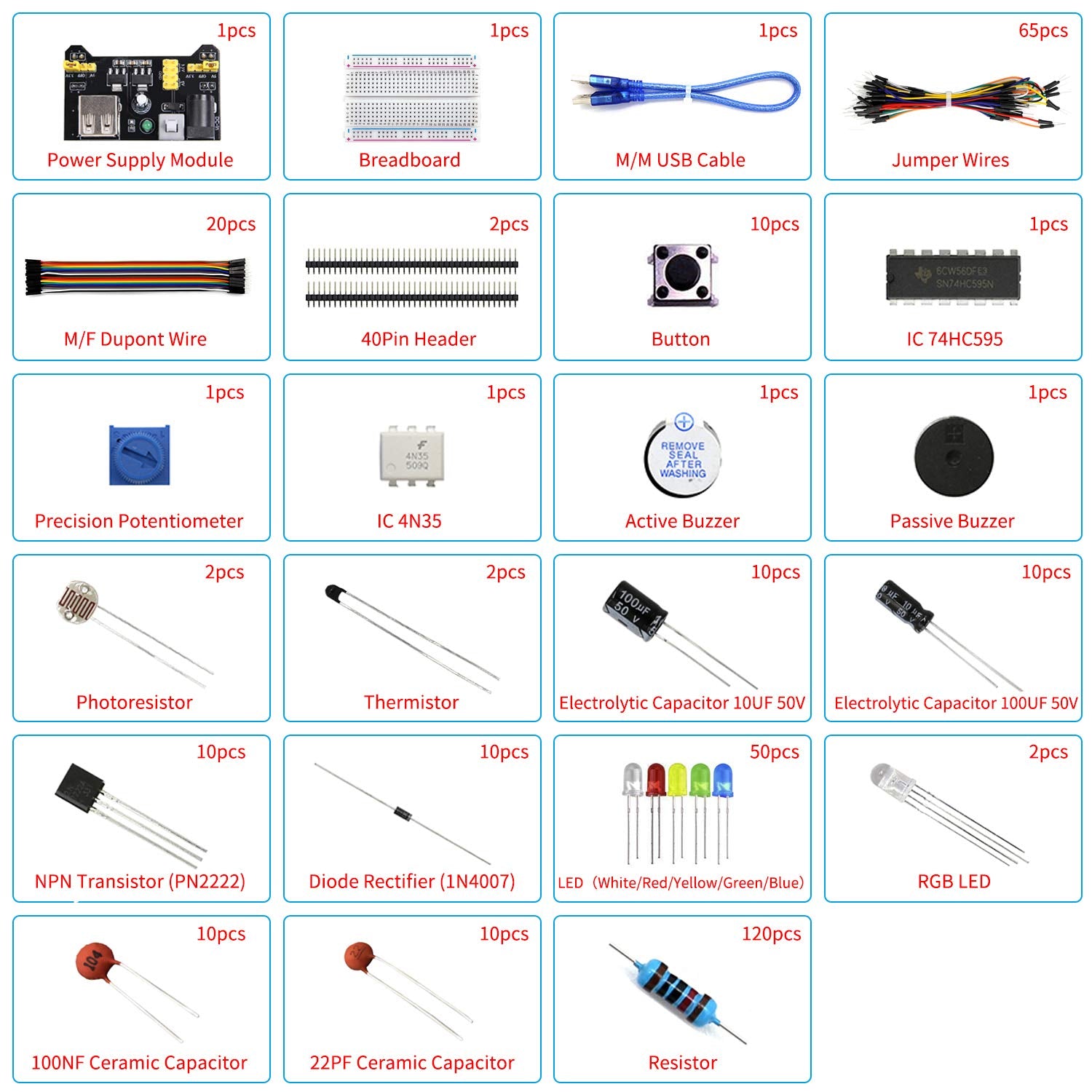 • Highest Cost Components Kit: It comes with more than 300pcs sensors and components for fun and simple electronic projects.