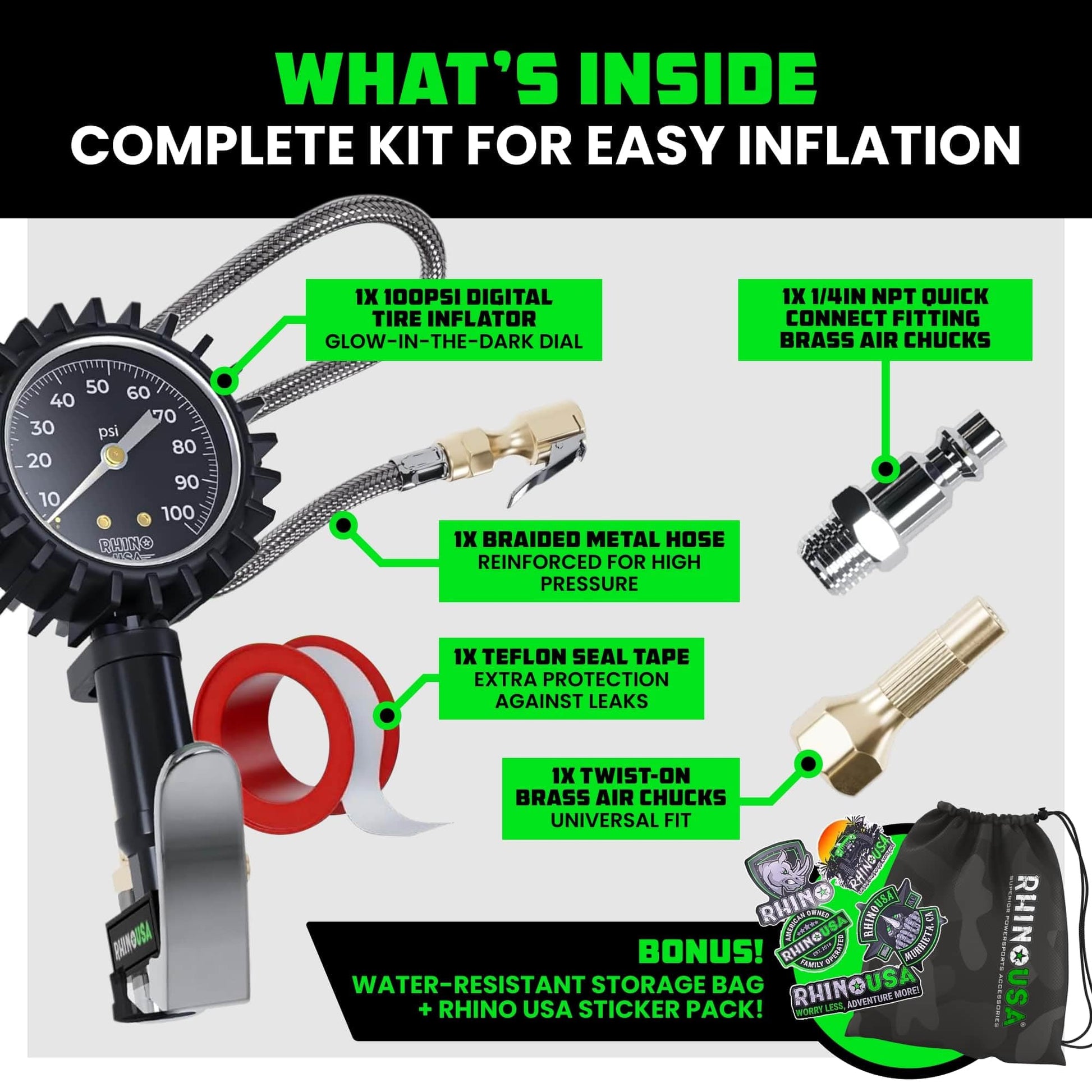 Rhino USA Tire Pressure Gauge with Inflator (0-100 PSI) - Heavy Duty Air Chuck and Compressor Accessories with Stainless Braided Hose, Large Analog Dial and Solid Brass Hardware for Truck and RV