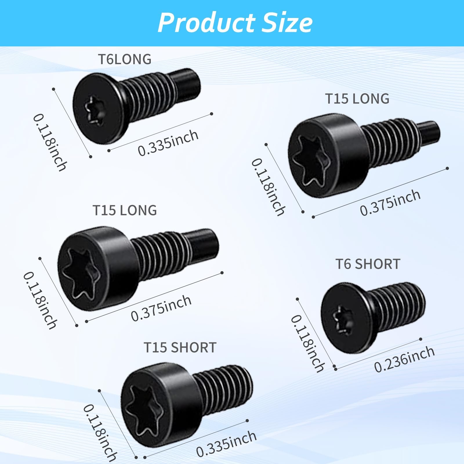 • 20Pcs Ring Doorbell Screws: 20pcs of 5 type doorbell replacement screws,T6 (short), T6 (long), T15 (short), 2 types of T15 (long), 4 pieces for each type. The precise dimensions are depicted in the photo, and these screws are of very high quality.