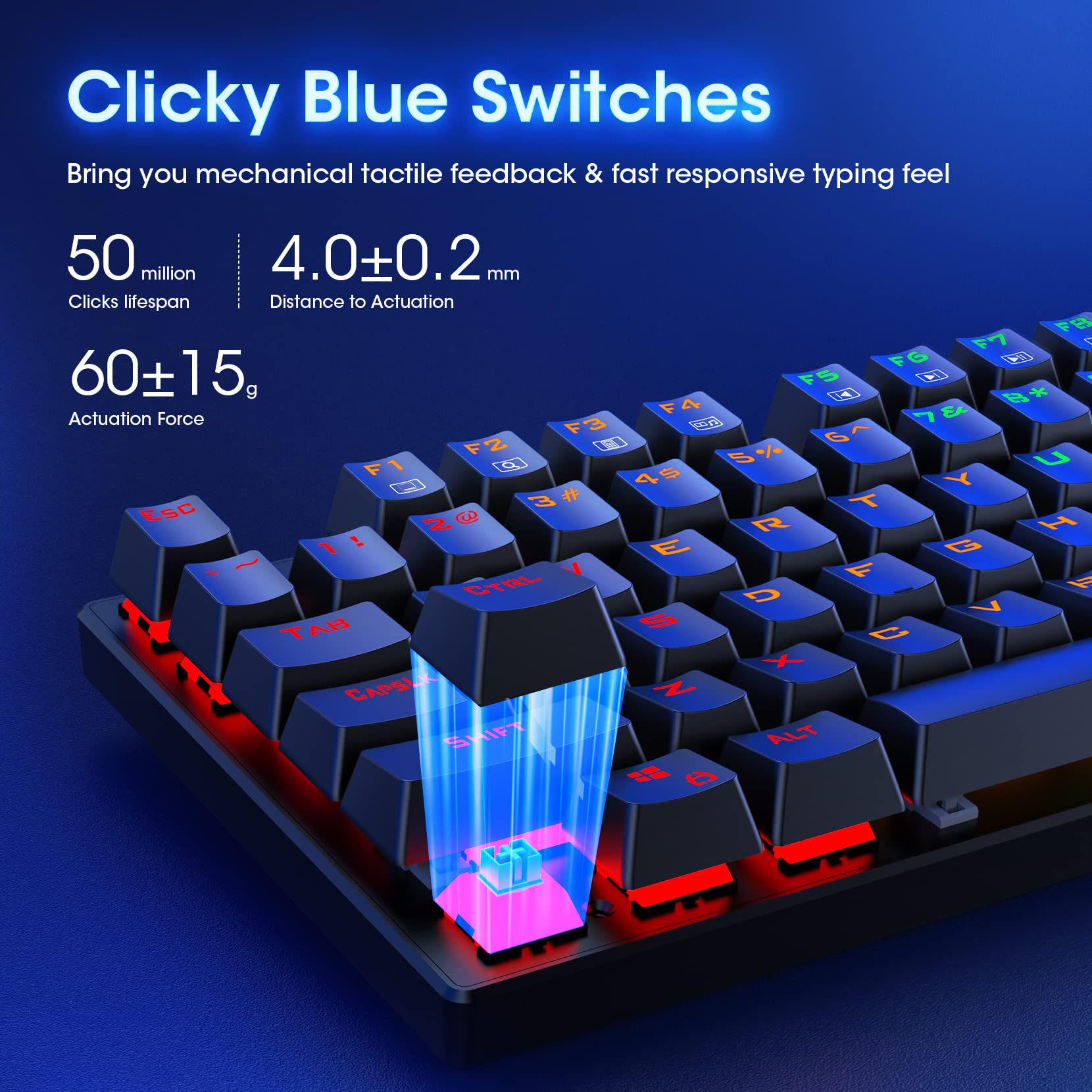 • 【Mechanical Keyboard: Responsive BLue Switches】RisoPhy PC keyboard features clicky keys which offer you higher accuracy and quicker response with an enjoyable click sound when typing.This keyboard is more comfortable to type on since it features deeper key travel,greater feedback,and more space between keys.For those who prefer keyboards with a more tactile and 'clicky' feel,our keyboard with BLUE switches is a nice choice.