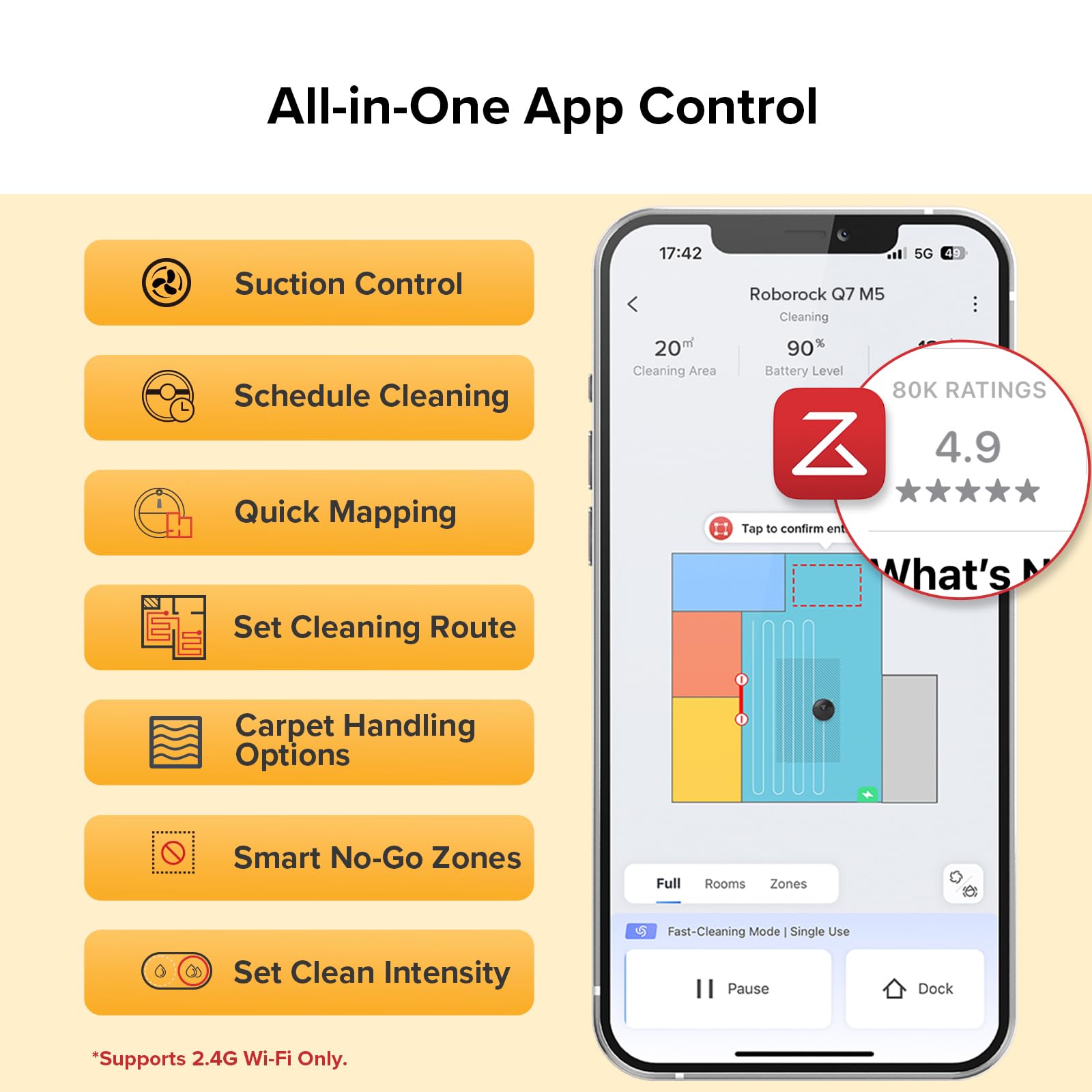 • Smart Navigation with Precise LiDAR: Quickly scans and builds precise maps in seconds, finding the optimal cleaning route for your home. You can visualize your home and add furniture, pet supplies, and flooring materials to the app.