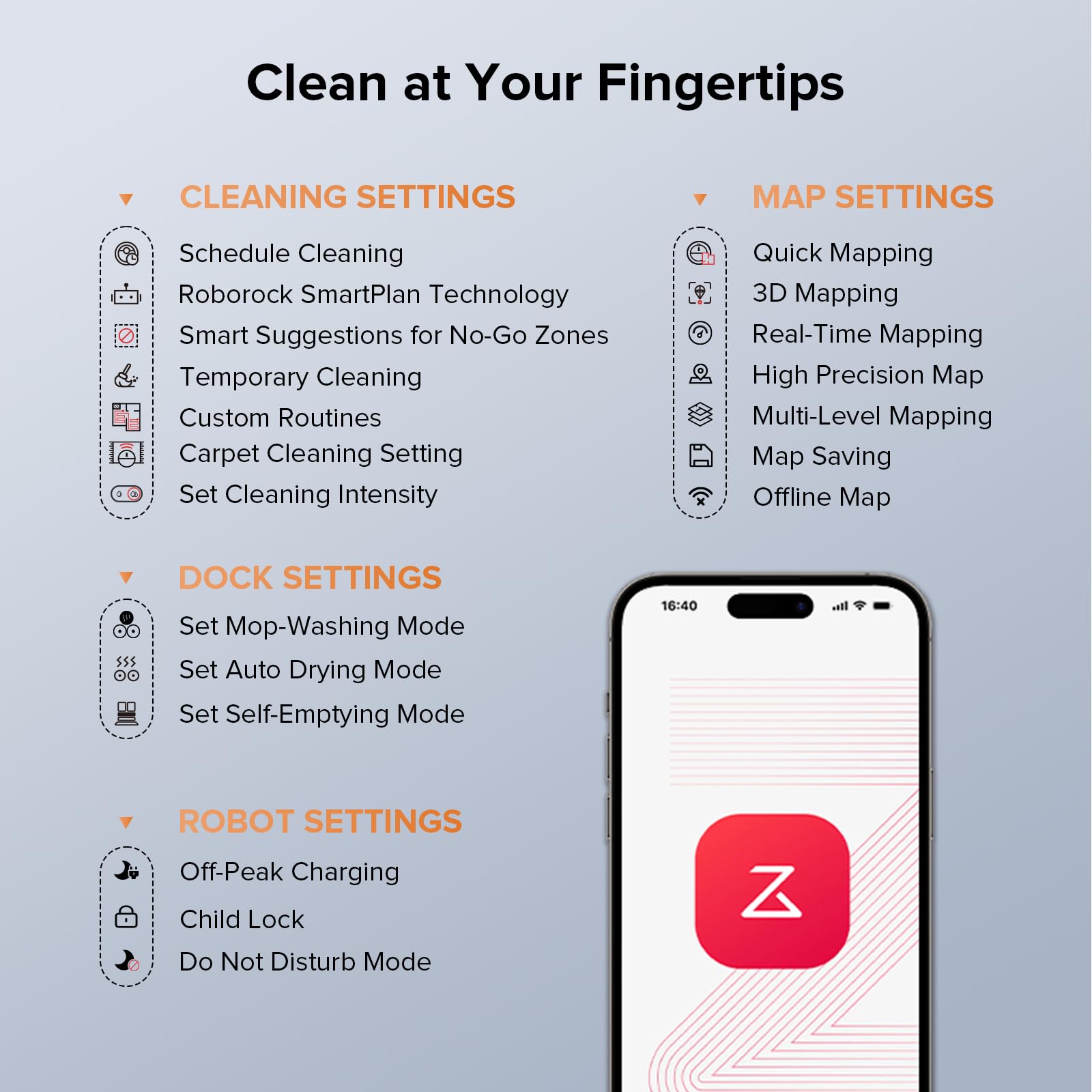 • Control at Your Fingertips: Manage all things with the upgraded Roborock app. Advanced AI algorithms ensure smarter, stress-free cleaning. Diverse functions, including routines, map details, washing temperatures, drying duration, and maintenance conditions, are easily managed in the app.