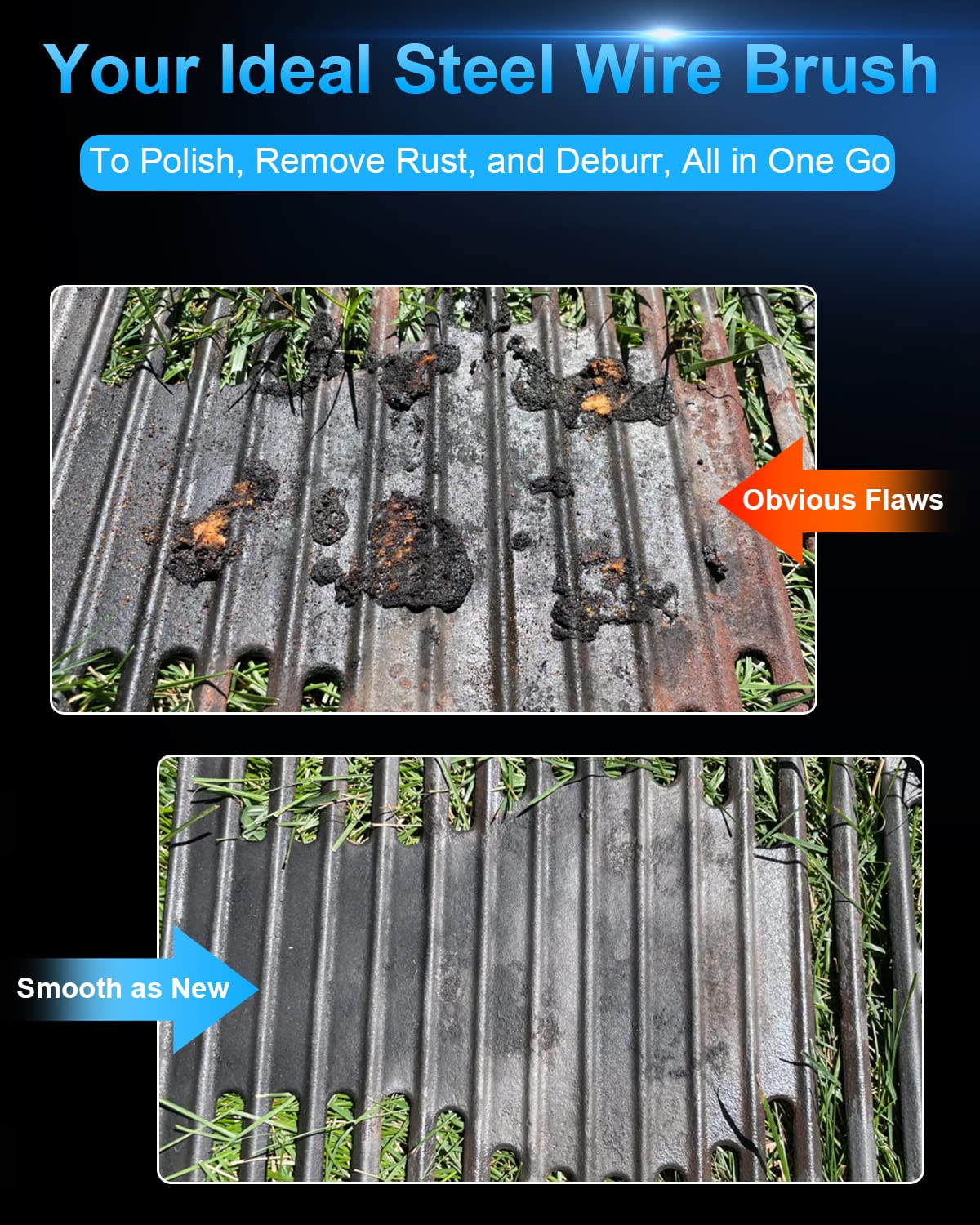 • Wide Applications: Easily and smoothly remove heavy corrosion, rust, paint, spatter and scale removal while also clean weld edges, debur metal and paint.