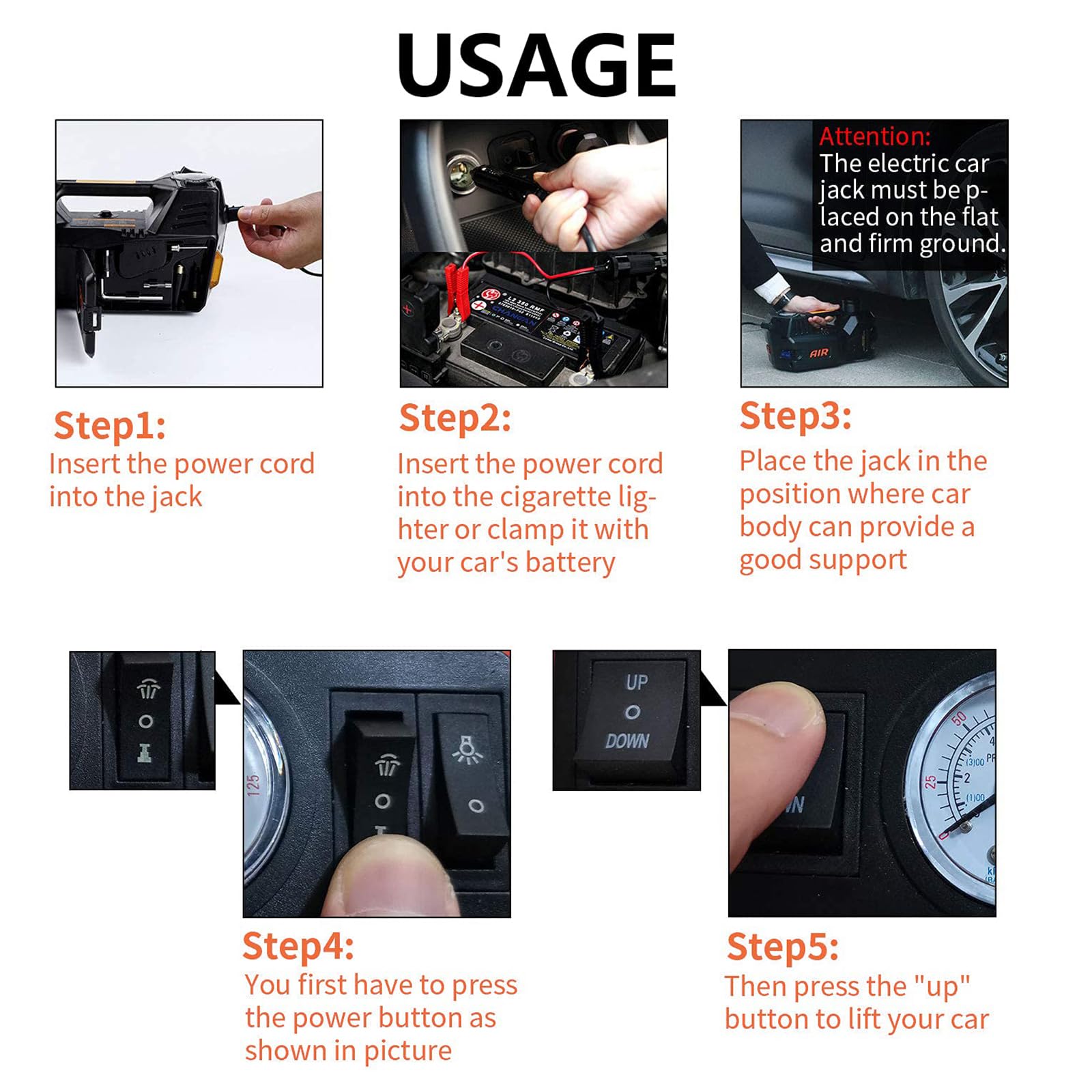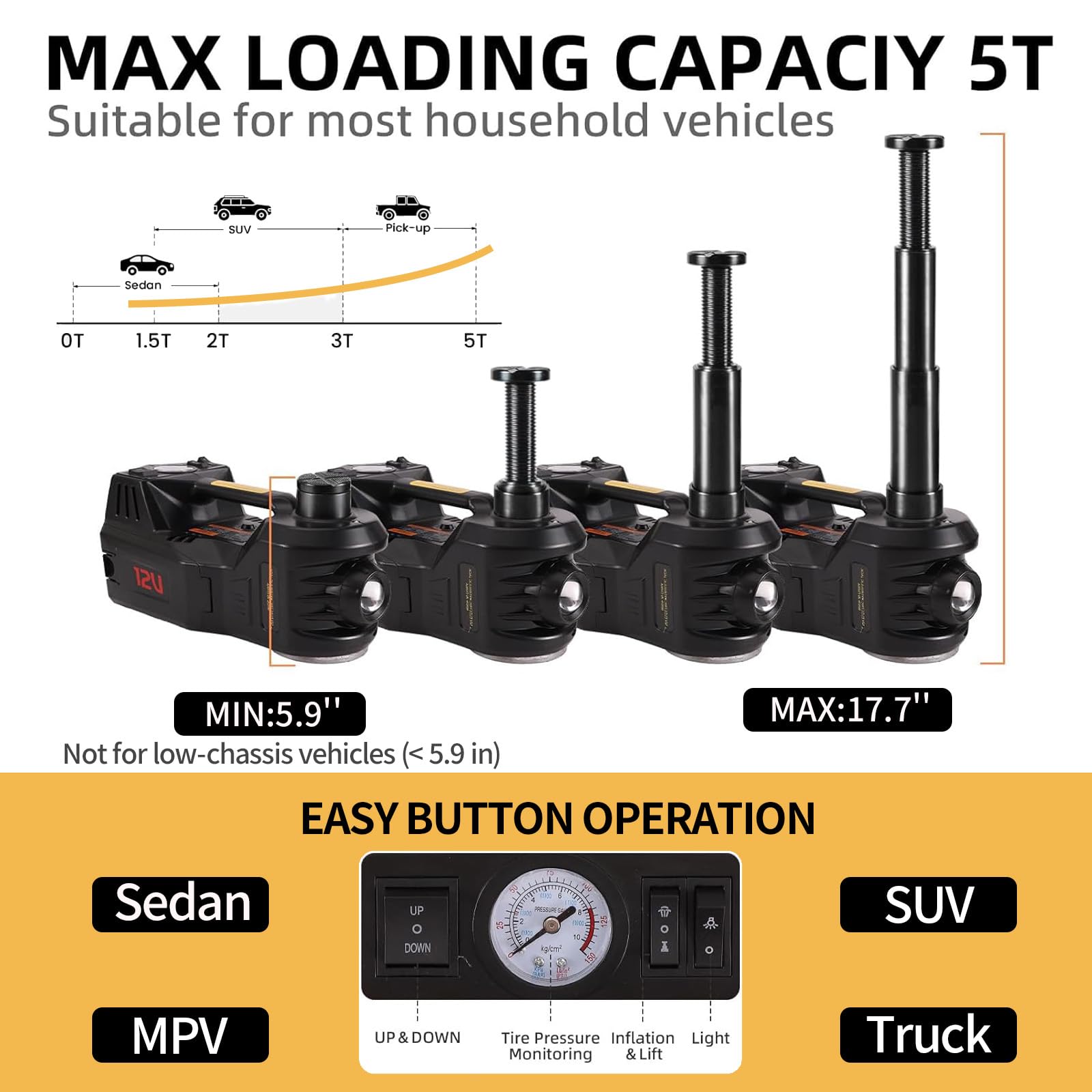 • Auto-Lift & Time-Saving: 12V electric car jack lifts 5-ton vehicles up to 17.7" in 60 seconds. High hydraulic efficiency outperforms manual jacks. Powerful motor suits sedans, SUVs, and trucks. Easy to use—even first-time users can lift with confidence