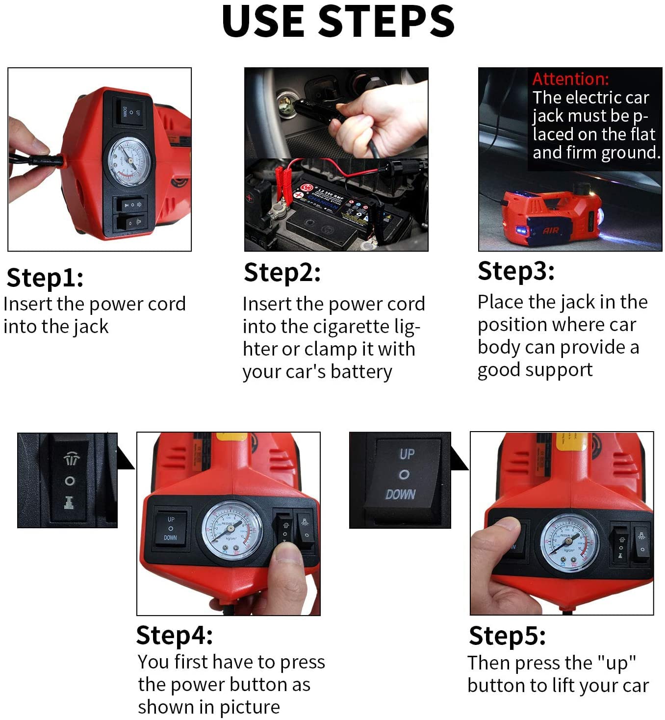 • Safe & Reliable: Electric jack uses a stable hydraulic system with automatic stop at max height or overload. Self-locking design prevents slippage during use. Includes pressure relief wrench plus LED and warning lights for safe tire work, even at night