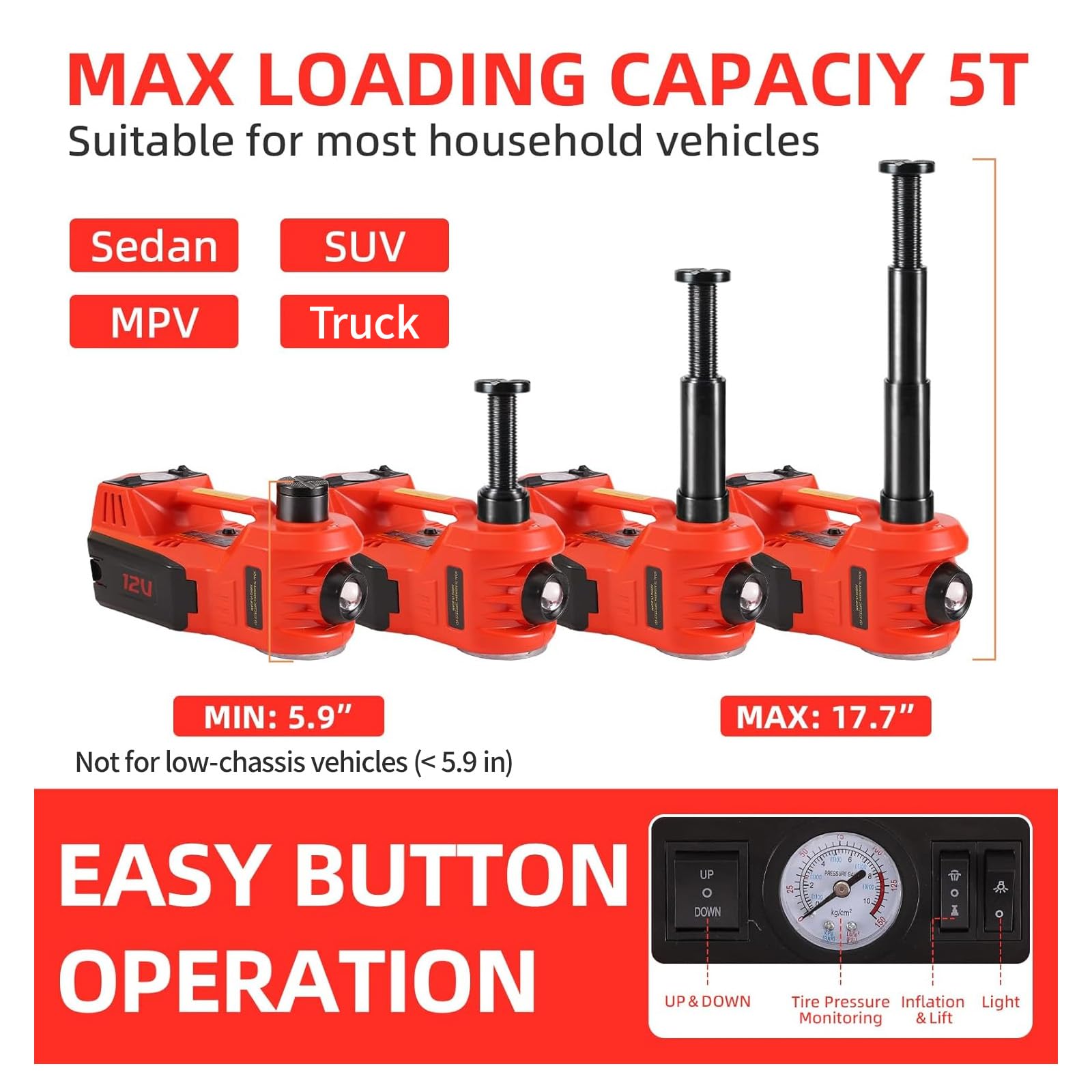 • Auto-Lift & Time-Saving: 12V electric car jack lifts 5-ton vehicles up to 17.7" in 60 seconds. High hydraulic efficiency outperforms manual jacks. Powerful motor suits sedans, SUVs, and trucks. Easy to use—even first-time users can lift with confidence