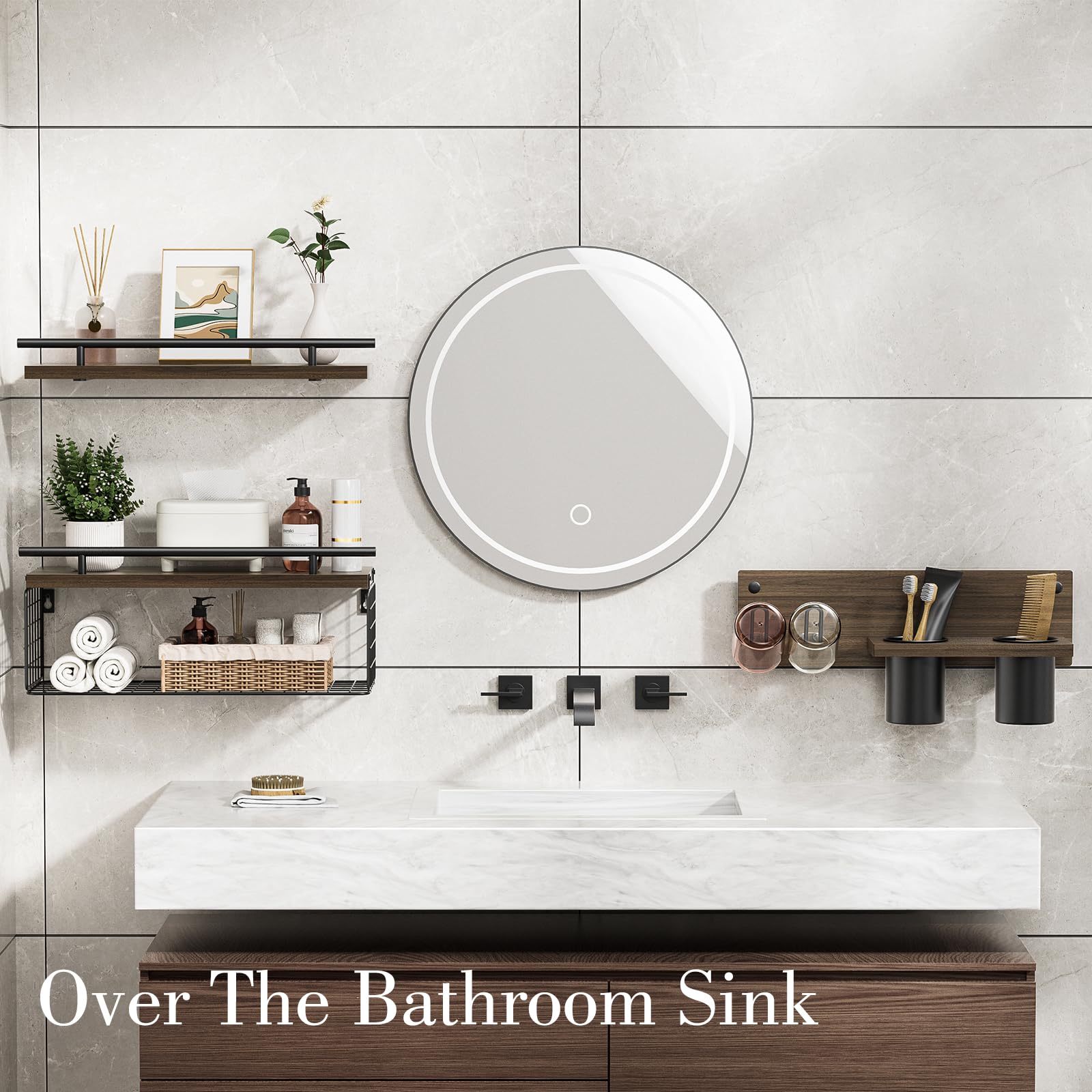 RoleDes Bathroom Floating Shelves with Hair Dryer Holder - Wall Mounted Wood Wall Shelf with Blow Dryer Storage Over The Toilet - Set of 3 Rustic Brown Farmhouse Decor