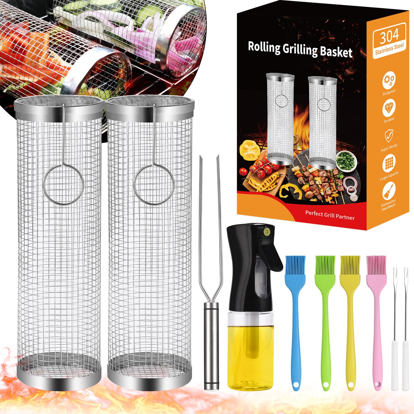 Rolling Grill Baskets (2PCS), Stainless Steel Grill Basket, Dishwasher Safe BBQ Grill Accessories Portable Grill Baskets for Outdoor Grill for Fish, Shrimp, Meat, Vegetables, Fries Outdoor Cooking Camping