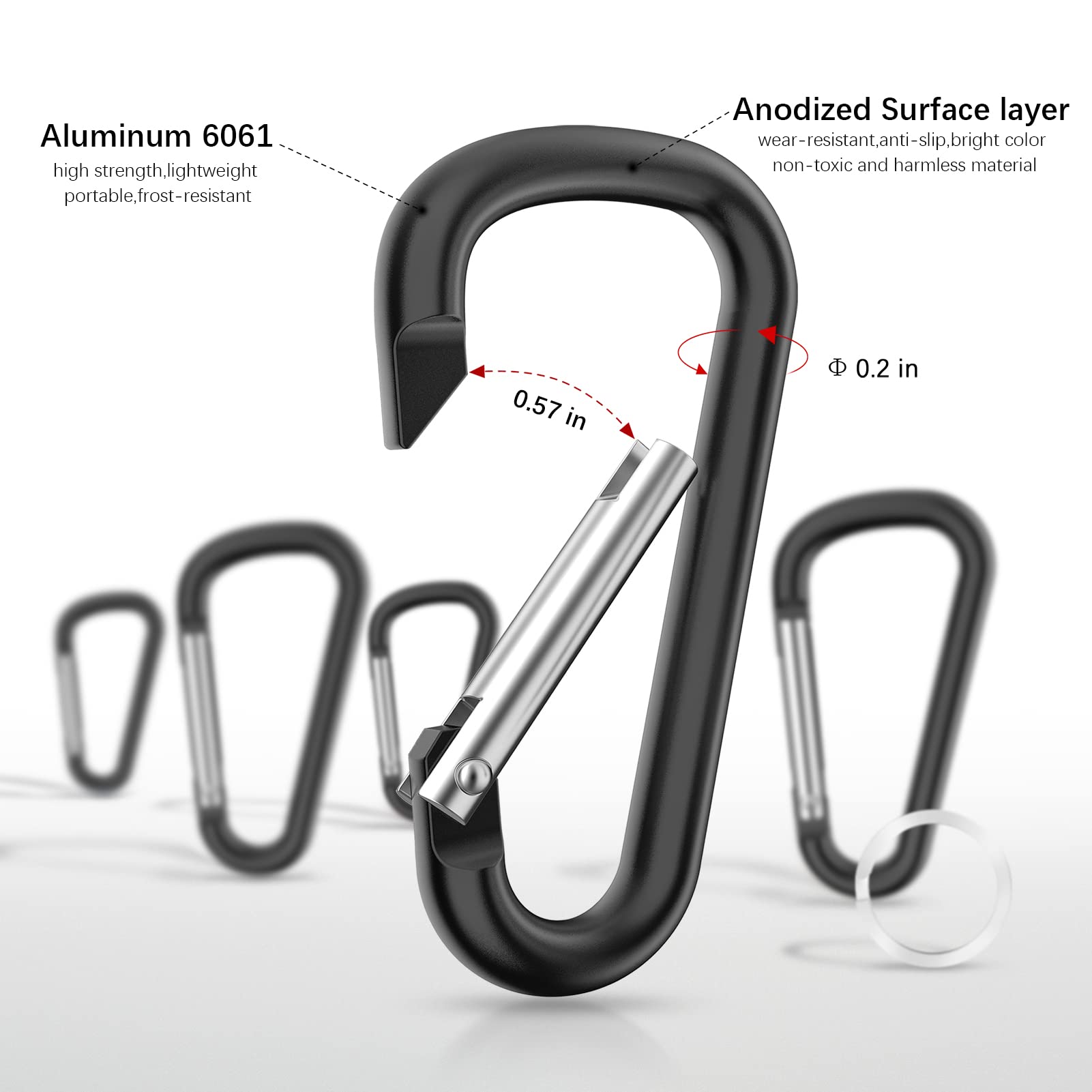 • ✔【Product Include】- 2.28" Carabiner Clips (20 Pcs) and 30mm Steel Rings (20 Pcs). These Mini Size Aluminum Caribiner are perfect for Lobster Clasp, Backpack, Belt Buckle, Key Ring, Chains, Hiking, Fishing, Pet, Traveling, Indoor/Outdoor Equipment Gear