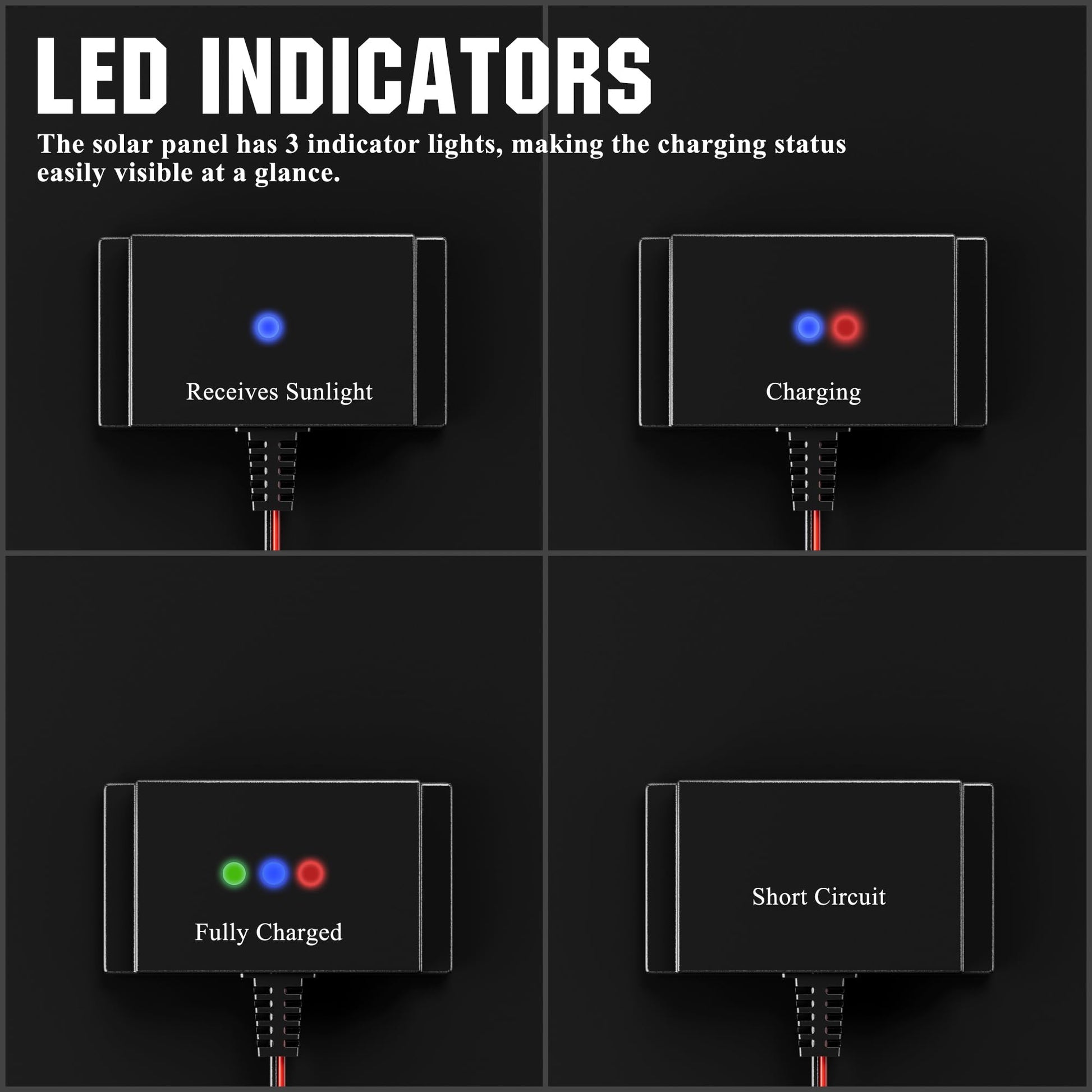 • Visual Charging Status: The controller has 3 indicator lights: blue (sunlight exposure); red (charging); and green (battery full). Easily monitor the charging process