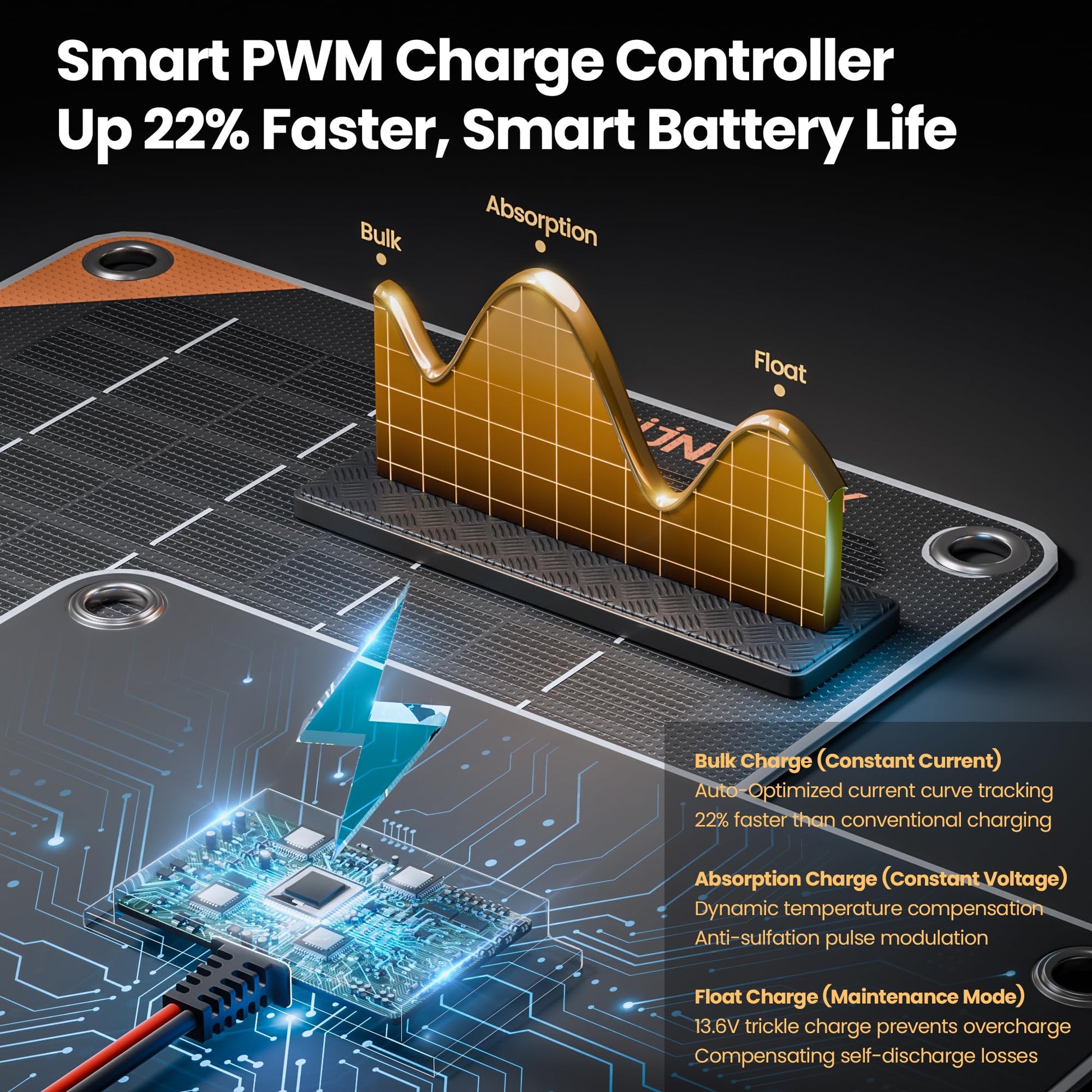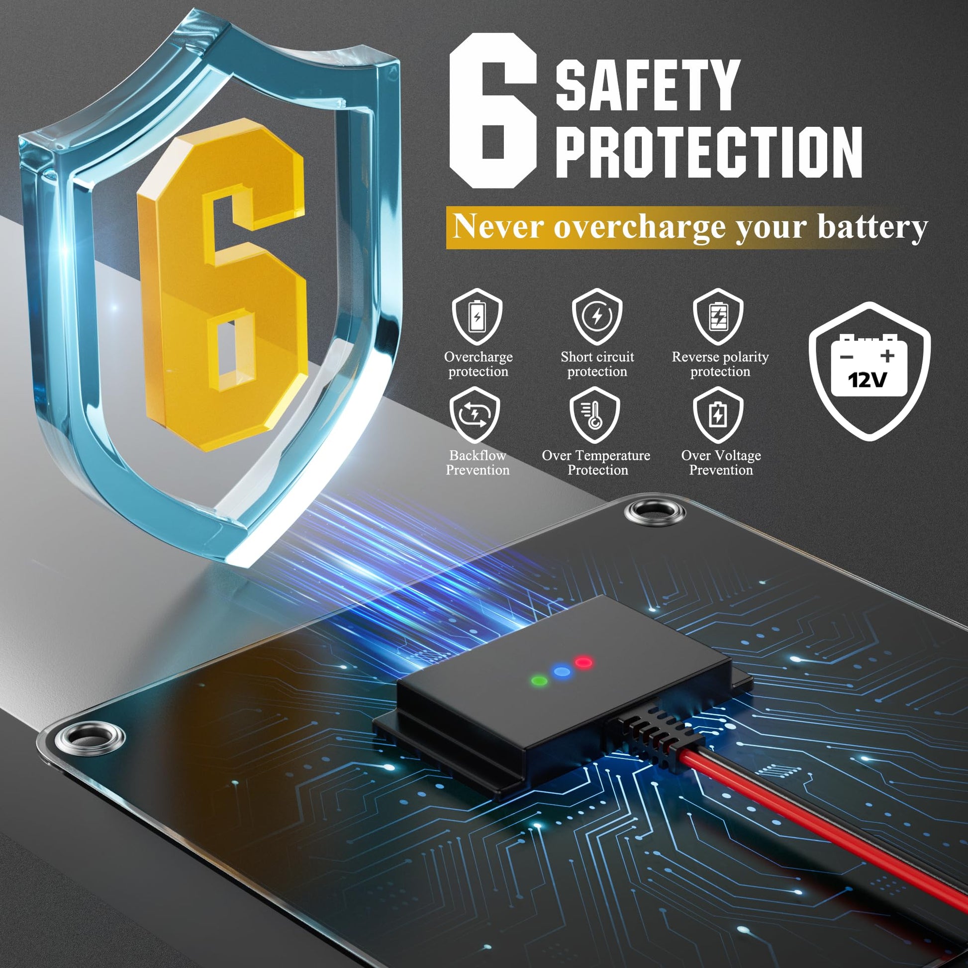 • No Overcharging, No Battery Drain: The solar panel includes a built-in controller that prevents overcharging. When the battery is full, the controller stops charging automatically and resumes when the voltage drops. Our solar panel system won’t drain your battery
